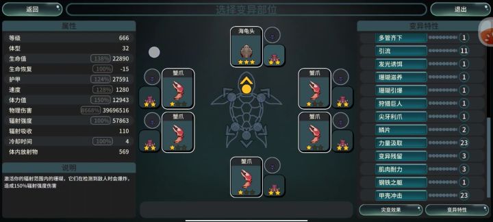 我感觉最强的进化路线,应该是前期加速度和伤害,拿一个满级卵巢(这个可以挡致命伤,所以不要血量),拿最超标的口器 突刺口(伤害最高,范围最大,吃食物范围最大),拉满速度,后面看着拿到冲刺消耗血条就可以无线冲,我拿翅膀只是感觉好看,感觉吸血或卵巢更好点,突刺口一般拿前面就行了,后期叠加物伤,冲刺加伤