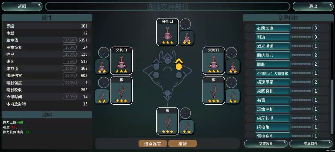 蝠鲼鱼身好用一点,基因把升级禁用和开局禁用点一下(避免重复出现不需要的选项),开局有突刺口就拿突刺口,尾部拿个树根或者卵巢留容错(等爱心多了可以替换,不过换不换无所谓),前期升级的时候只点生命回复和少量的生命加成,等感觉够用了就点物攻就行了,#游戏攻略 中期拿速度和翅膀,等到玩命冲刺出来,就可以游龙了。#游戏攻略 #游戏攻略