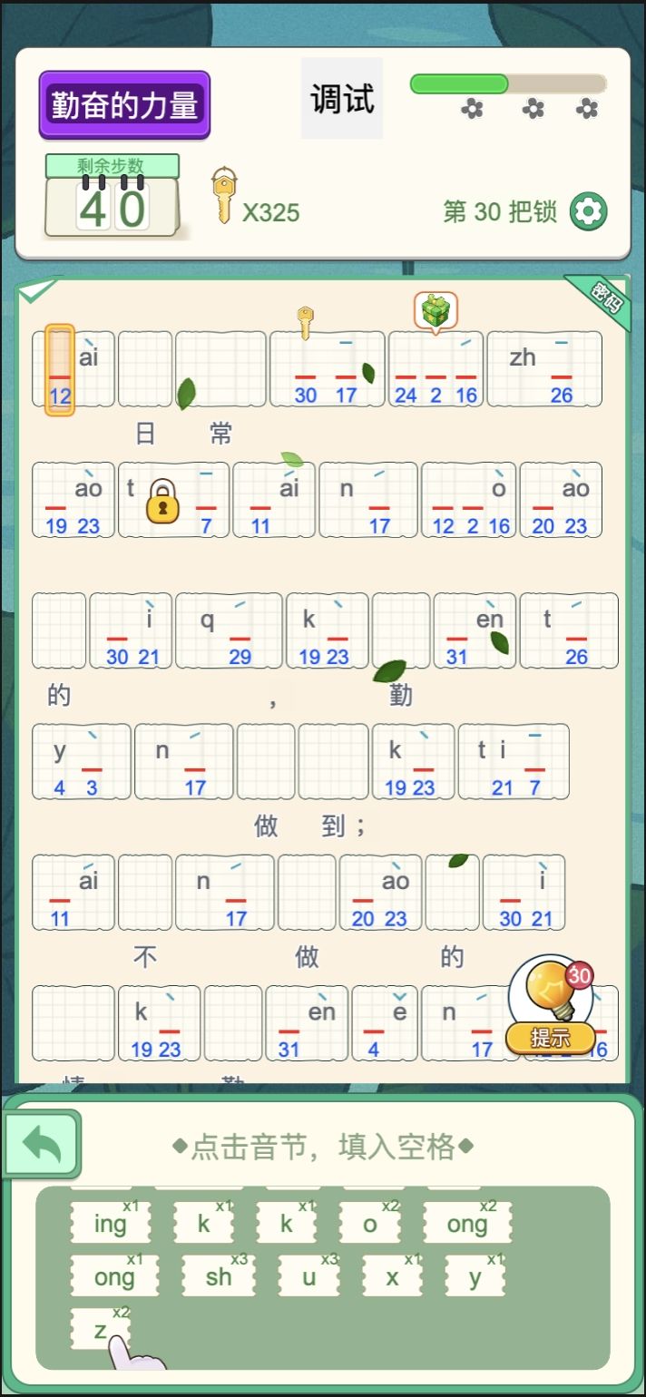 限定关卡第一期周五重磅开启,共设 10 关等你来挑战! 核心玩法 根据文字语境揣摩含义,从下方音节候选区中挑选合适音节,填入红色横线处,组成正确拼音。成功拼出后,将解锁对应汉字作为提示,助力你逐步破解更多空格密码。 关键规则 若两个红色横线下标注的数字相同,则这两处必须填入完全一致的音节。破解时需结合拼音规则、词语搭配习惯,以及对整段文字的熟悉度,综合推导所有空格的正确音节,完成全关挑战! [表情_吃瓜]
