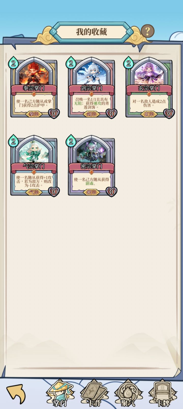 评价仅个人观点#和平武馆 五个宗门:拳宗:前期能叠甲顶住,后面用质量卡打消耗,缺点是缺少过牌剑宗:过牌能力极强,伤害极高,缺点是没有回复能力 还有一点是本次测试很多bug对剑宗都是优势玄宗:前期可以使用技能拖回合,后面一张天罗地网控制好可以扭转战局,缺点和剑宗一样没有回合气宗:有很强的成长性,配合各种中立卡可以打出奇效,缺点是前期没有太多质量怪,没有怪前期会很被动密宗:只能说勉强能玩,