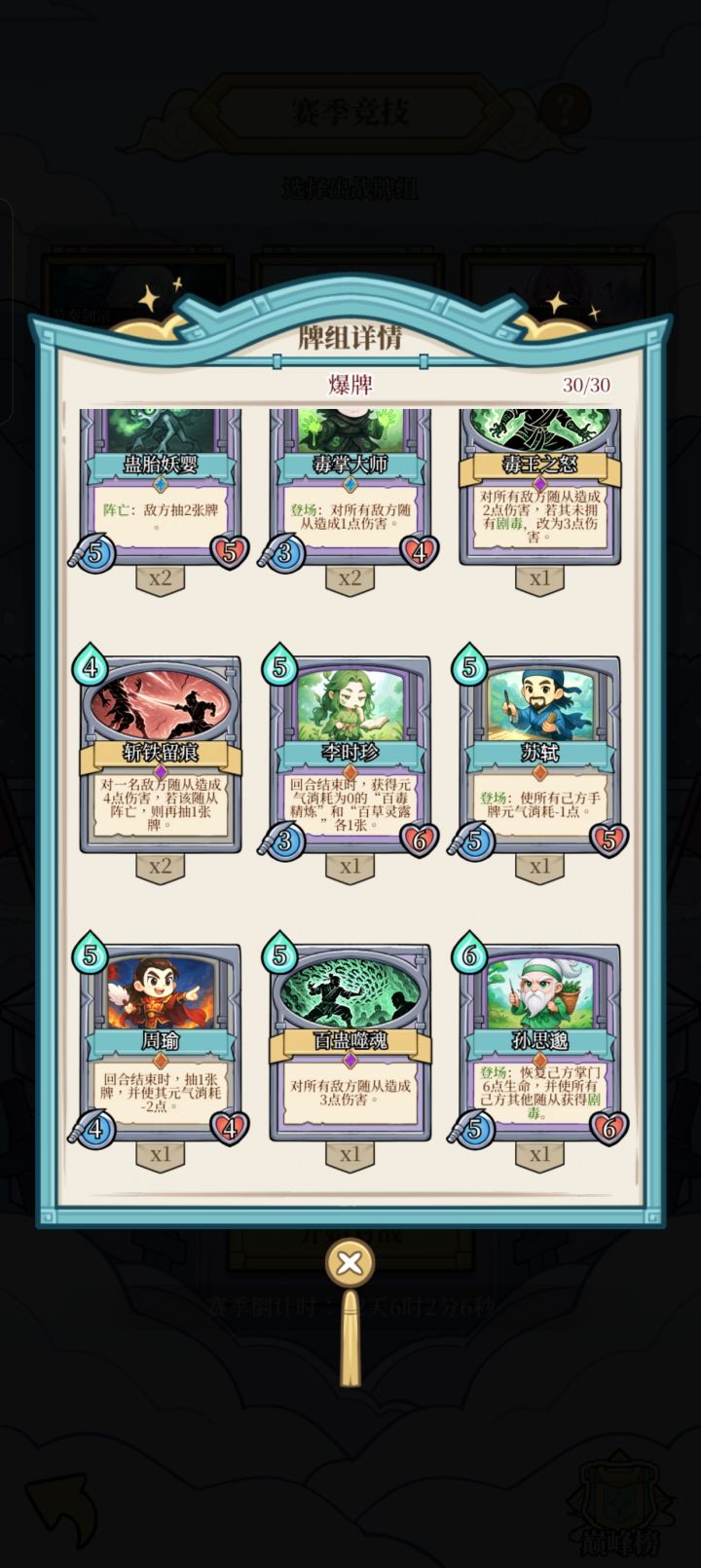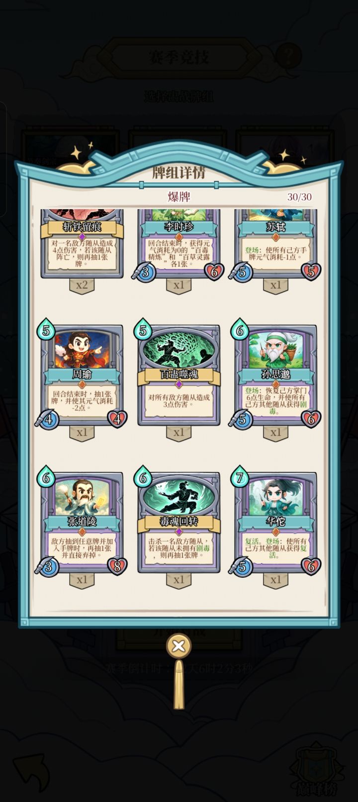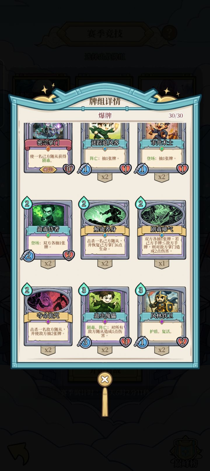 打了两天的真人匹配,在之前的构筑优化情况下的爆牌密,除了打的特别慢,比较吃对局经验之外,没有特别明显的外战弱点(内战看谁带的厚)下面是卡组:#爆牌##随从-市井术士x2#随从-风林铁卫x2#随从-蛊虫傀儡x2#随从-蛊胎妖婴x2#随从-华佗x1#随从-毒掌大师x2#随从-蛊毒侍者x2#随从-苏轼x1#随从-迷踪追风客x2#随从-李时珍x1#随从-张道陵x1#随从-孙思邈