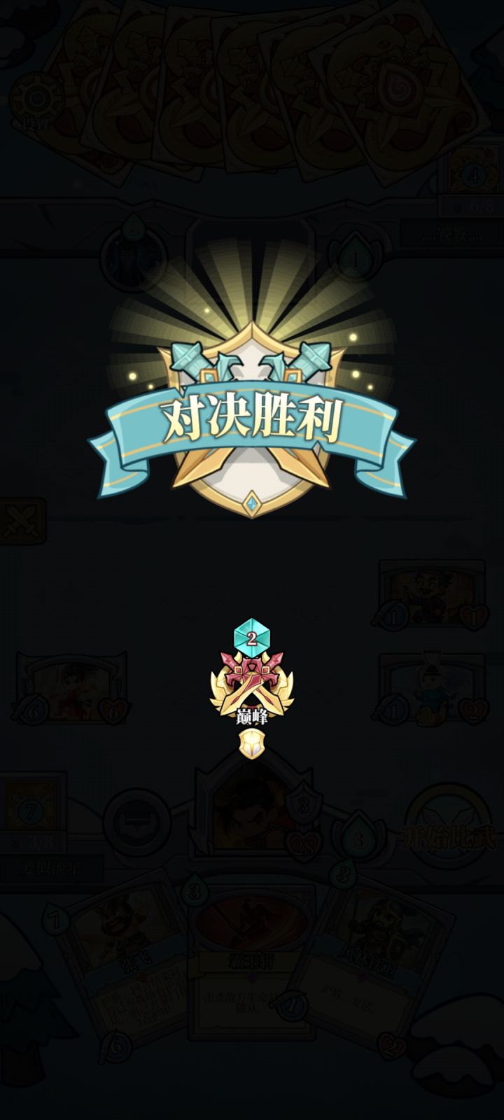 给一些萌新一点小小的上巅峰攻略,在前期的时候尽量用曹操或者扁鹊去组卡组,1费抽1张一共4张卡,护盾牌都上,尤其是3费22护盾加重生,远程3费33,4费的全体打2,带有重生的卡,加上一些前期给你的橙卡,选几张职业专属质量好点的伤害牌或者武将卡,轻轻松松可以打上巅峰,有些人说,大家都有哪张厉害的橙卡,告诉你们,把你们抽到多余的卡牌去卡组上方一键分解,然后给你那个武魂,去你未有的牌里找你认为超模的卡牌,