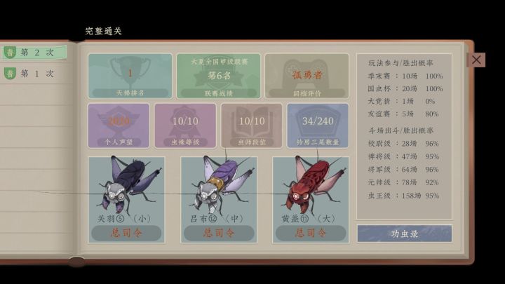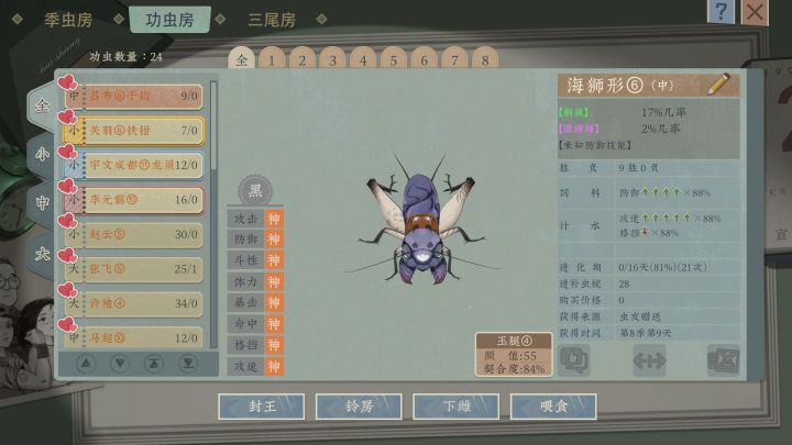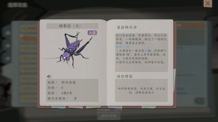 这是一款怕是只有国人制作组才敢于尝试的另类“宝可梦”题材。玩家的目的十分明确,就是利用捕捉、购买及随机事件等方式获得形态及能力各异的蟋蟀。然后面对琳琅满目酷似一个个手办的蟋蟀大军,有针对性的进行培养并参与决斗最终成为蟋蟀界的斗罗大神。本作对蟋蟀各方面的刻画都十分用心,甚至像是书签、诗词等周边向的设计使其有了一定的文化科普功能。不过游戏在各方面的随机性都较强,且新手引导节奏有待改善。