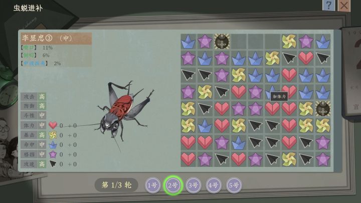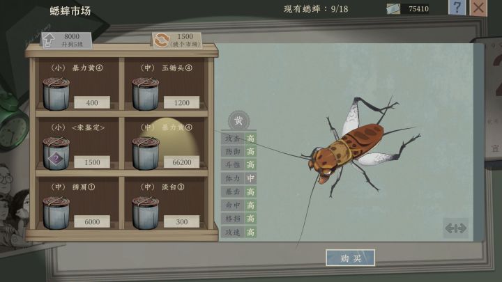 游戏核心的乐趣便是收集、养成与斗虫这三大元素了。只不过不同群体对于这三大元素的喜好侧重不同。收集方面最简单粗暴的方式就是市场购买了,不过想要更容易的获得SS级蟋蟀,还得花钱升级市场。而对小游戏玩法感兴趣的则可以通过野外捕捉的方式获得。养虫的方式也很多,吃自然不必多说,喂食饲料汁水这是必须的,总不能让你的爱虫饿肚子吧?然后还可以通过洗虫、封王、进补方式等提高属性,花样还是比较繁多的。斗虫方面除了参加正规的赛季比赛外,还能在通过一些偶遇事件触发战斗。作为主人“小智”,虽然不能对蟋蟀进行完全的微操,但是可以选择打草策略,例如提高再战率、上攻击Buff等。看着蛐蛐你来我往也是十分有趣,当然如果能够秒杀对方那就更爽了。