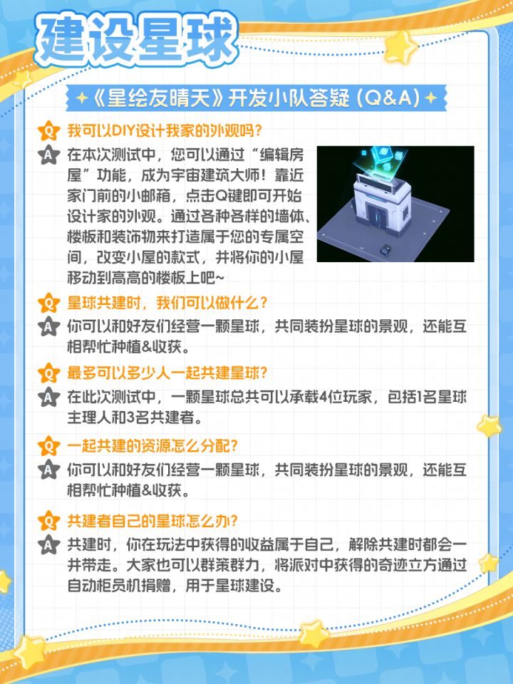 轻轻念着你懂的咒语 一扇门就通往银河系 给你一瓶魔法药水 我们一起去太空旅行 想和你跳出地球,飞奔到宇宙 #星绘友晴天 融合了生活模拟与休闲派对玩法,将支持PC、移动多端互通。你将成为一颗立方星球的主理龙,和朋友云同居,白天种种地、晚上开Party! 立方星球有六个面,游戏中也有“六边形”玩法循环:探索-搜集-建设-养成-社交-创造,保证让您获得新颖的、有趣的游戏体验!