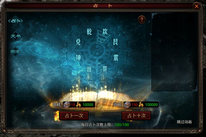 前往天书-占卜系统中进行占卜可以获得天书材料以及吉人天相效果占卜一次需要消耗15占卜石和10000绑金。占卜石可通过铁血战场获取,绑金可通过BOSS掉落、分解高级装备、活动获取等方式获取。【更多提示】1. 消耗占卜石可进行占卜,占卜后会根据不同的卦象获得不同品质的奖励。2. 占卜出的BUFF效果直接生效,重复获得可提升BUFF效果。3. 占卜出的天书残叶可合成天书文字(只可合成一级的)。
