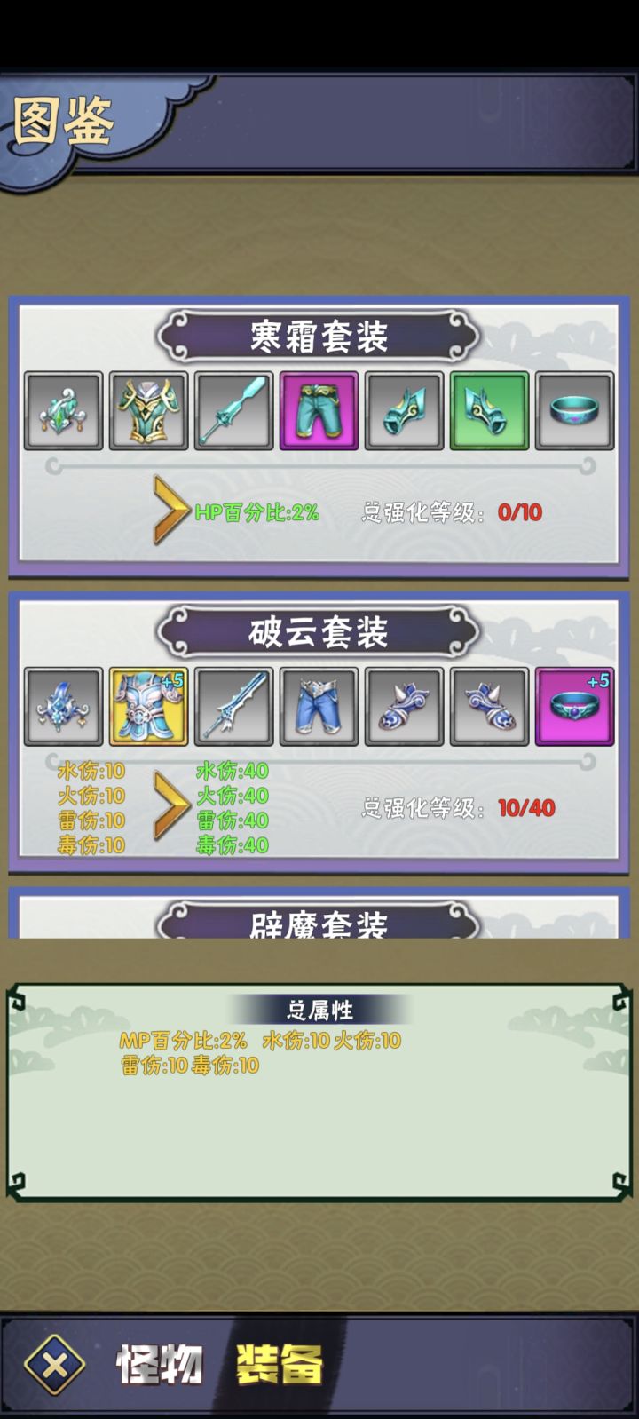 图鉴里分怪物图鉴和装备图鉴。怪物栏每个图黄金怪物击杀一定数量给金币和元宝。装备栏每套装备强化到10-40-80-130—200获得对应的属性提升。 ##欧皇无敌