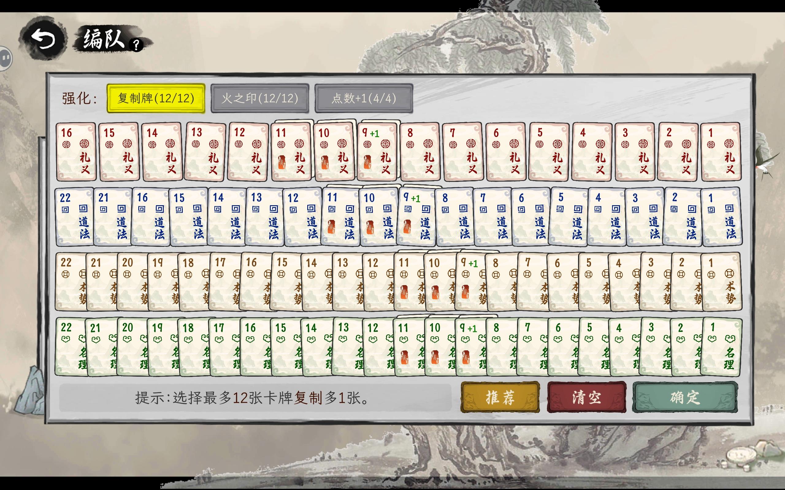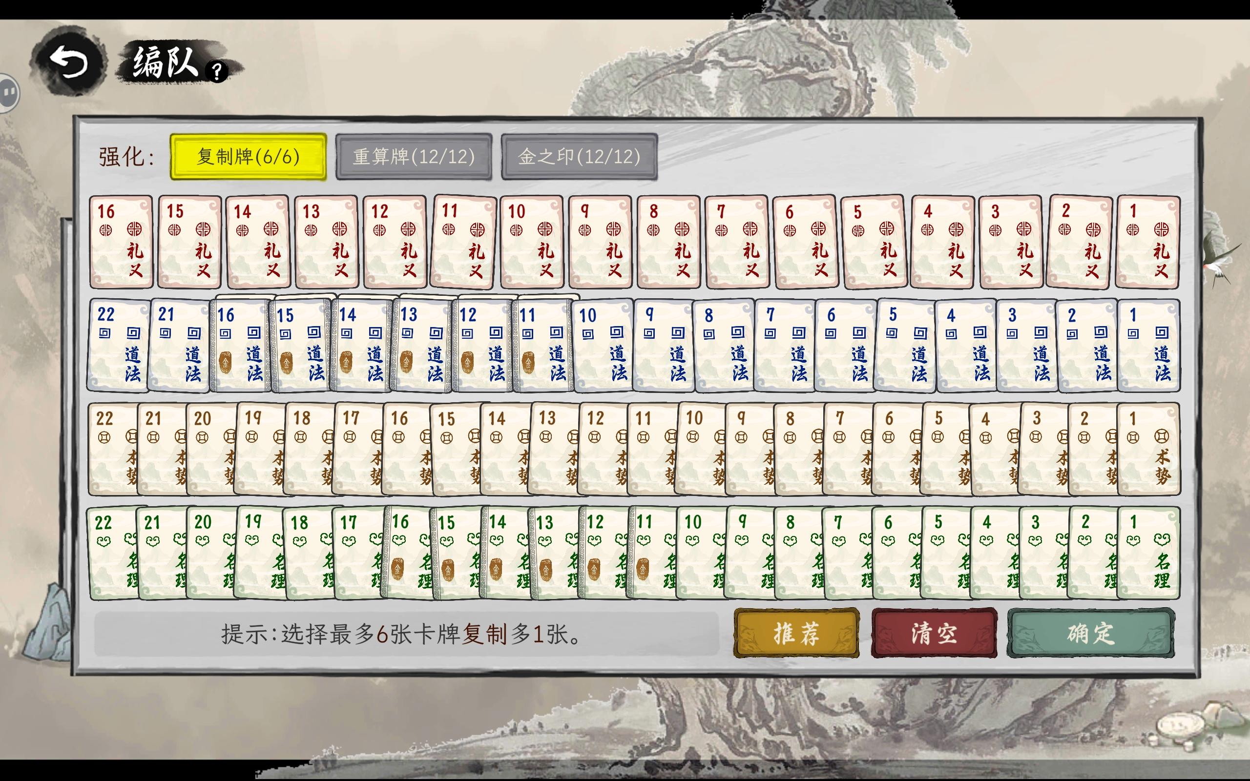 首先把三神放在每队的最后,前两队是一边计算牌一边做乘法,最后一队是牌计算好了再做乘法。两种算法对左边数值没影响,但是“触发计算时候增加倍数”的情况要更适合前两队。我的三队相对起来没有后期才能拿到的人,而且讲真三神之外用谁都差不多,不会影响通关。里面的配置也大概是这样了,我认为基本是配到头了很难有什么提高。争取要能保证每回合刷满可以做到刷空一遍牌堆,相当于在牌堆里面找牌,所以不要过多复制牌,会影响最