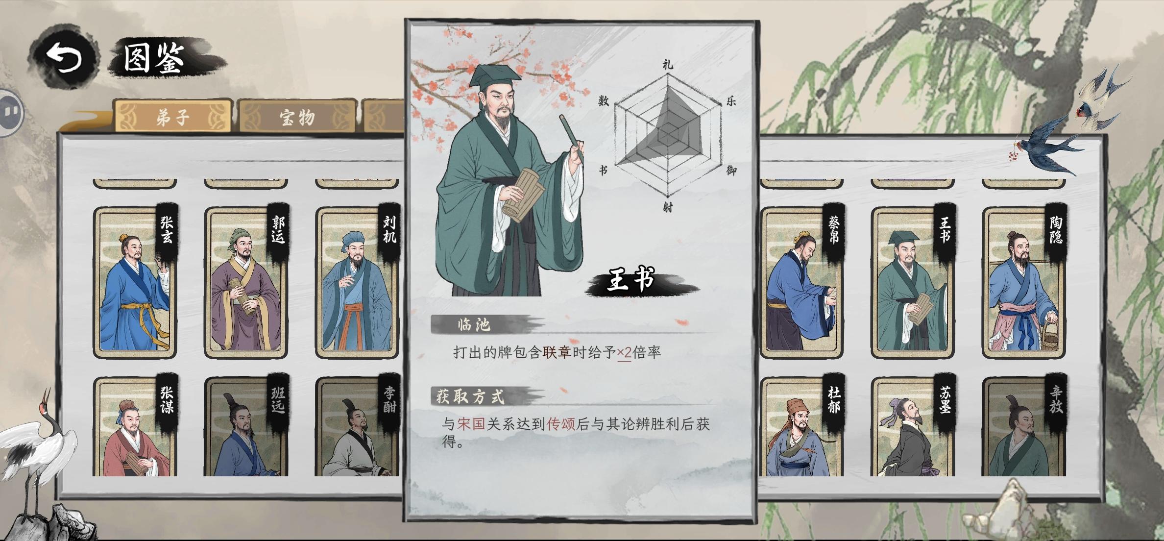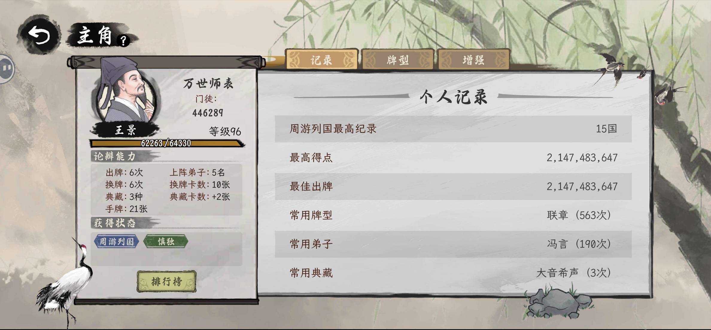 全图鉴,最高得分,三菜刀队镇楼。最强木印、金印,超模最强弟子:史录(金印),最强牌:联章三队建议(12.29增加了0队和4队木印队介绍):0.全部都可以的木印队,弟子随意有木印即可,宝物随意,上场全换牌,留木印在手上,最后打一张,基本所有木印相乘倍数都很高。1.(道法名理队)唐纵、东方辫、王真、张极、(随意有金印即可)宝物:河曲马、月牙剑、曲刃剑、白义(后期)、随候珠(后期)打法全上述