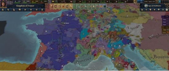 游戏中玩家可以选择各种国家开局,集中在亚欧国家,毕竟美洲非洲那些后面都是被殖民的。开局领土并不等同于国力,都需要慢慢发展,而且一些比较代表性的国家,比如罗马,奥斯曼,大明啥的,也是有一堆BUFF,这些BUFF也是变相的保证非玩家控制区域的格局会趋于历史发展,那些该成长起来的帝国基本都能逐渐崭露头角。