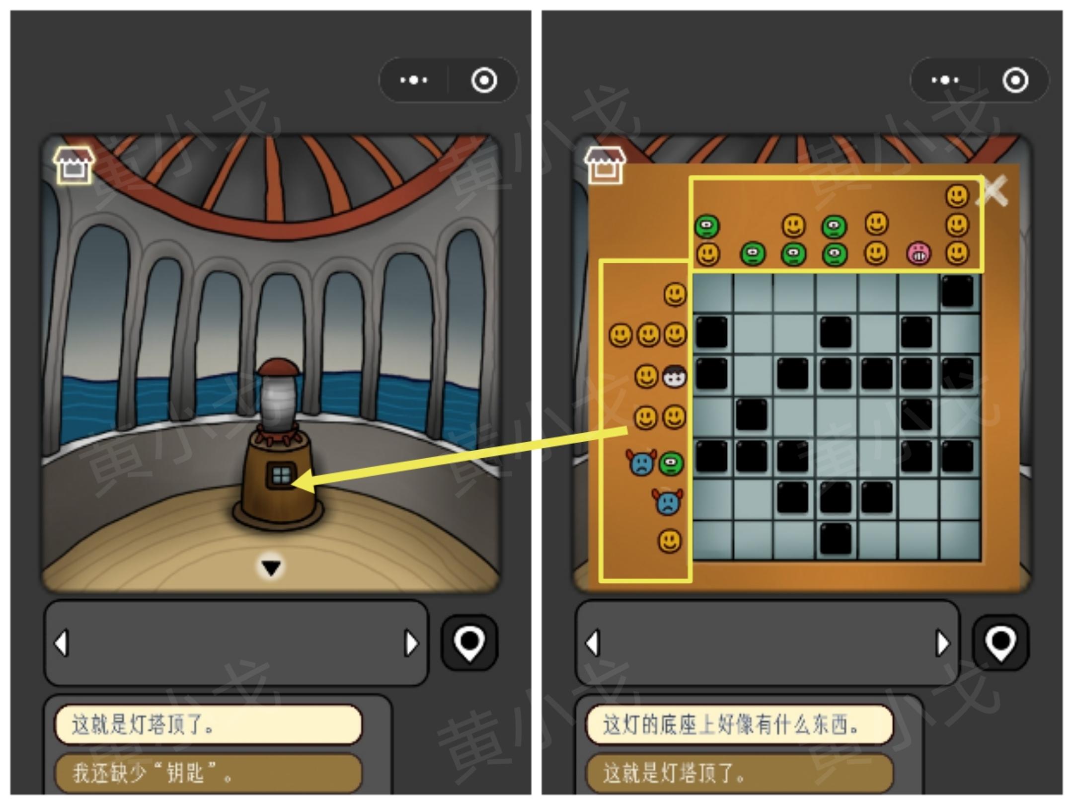 后面看似手上拿着鱼骨、钻石、花这些道具比较丰富,其实就是要找到前置金币道具打开机器,根据投影顺序从而获得最终的通关道具。