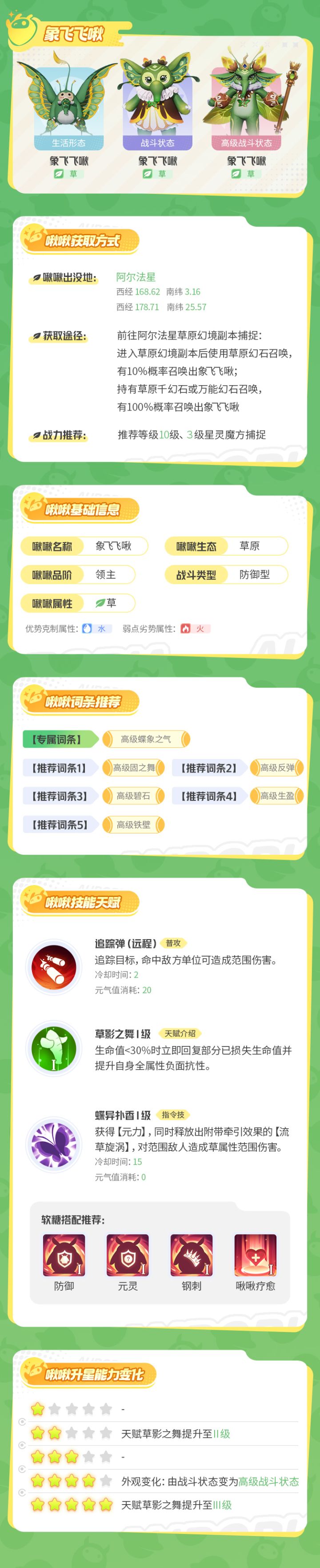 象飞飞啾:我的眼里容不得一点沙子,凡是草能生长之地皆为我的领土,我能守护住我的子民。今天给大家带来草原最强防御型领主——“象飞飞啾”的超详细养成攻略!作为草原生态的领主级啾啾,象飞飞啾以高生命、高护盾闻名!前期平民期超实用,还能吸怪聚怪,是刷副本神宠之一!