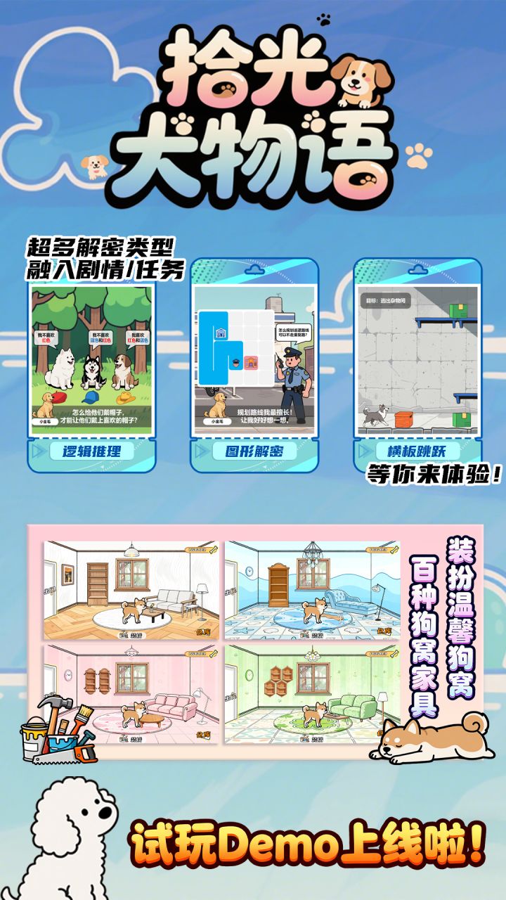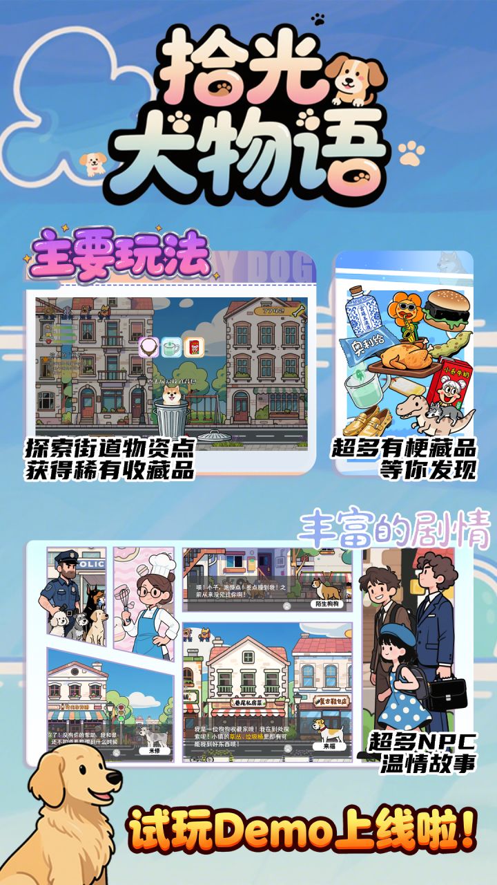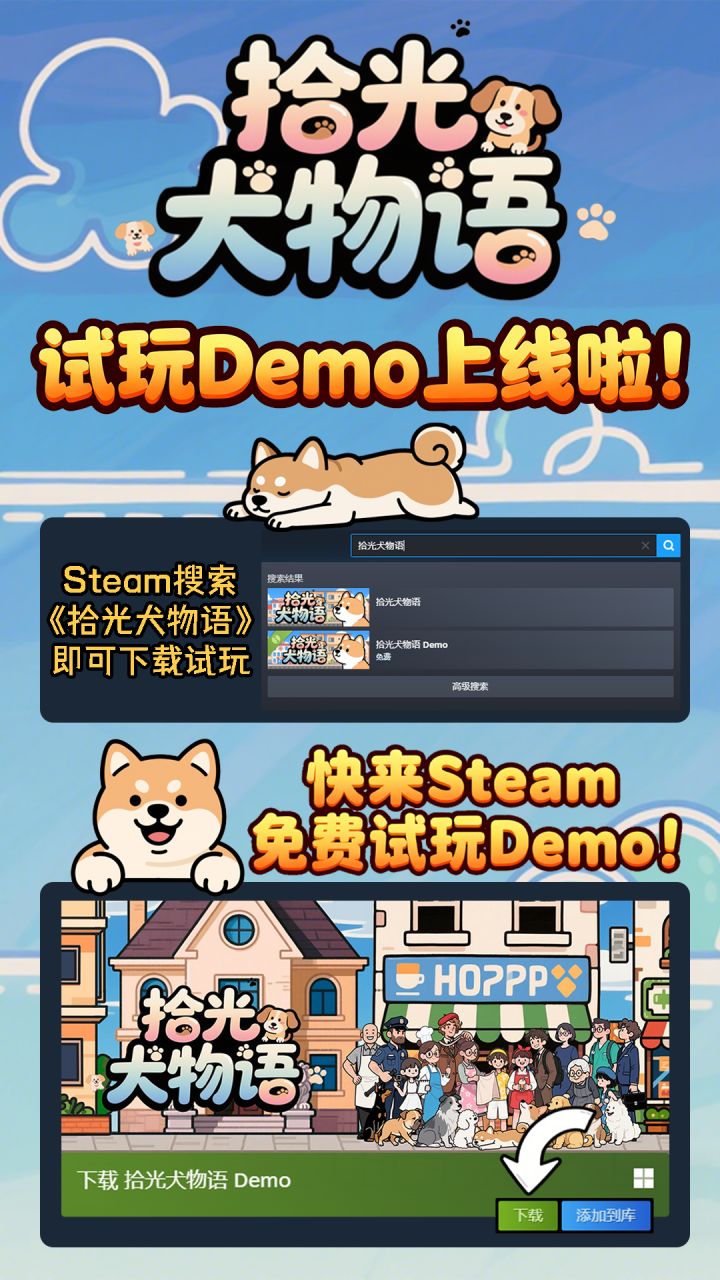 hello,大家好啊,我们的游戏首部 PV 来啦!【拾光犬物语】是一款 [休闲探索收集]游戏,我们已经在Taptap和Steam 创建了页面,搜索 [拾光犬物语] 就能找到哦! 在这款游戏中,你将操作狗狗在小镇的大街小巷探索,收集各种稀有收藏品;除了主要玩法,我们还增加了狗狗餐厅经营、狗窝装扮、狗狗装扮等更多小玩法,提供个性化、更丰富的游玩体验。而且,我们的 demo 也会在近期上线,让大家提前感