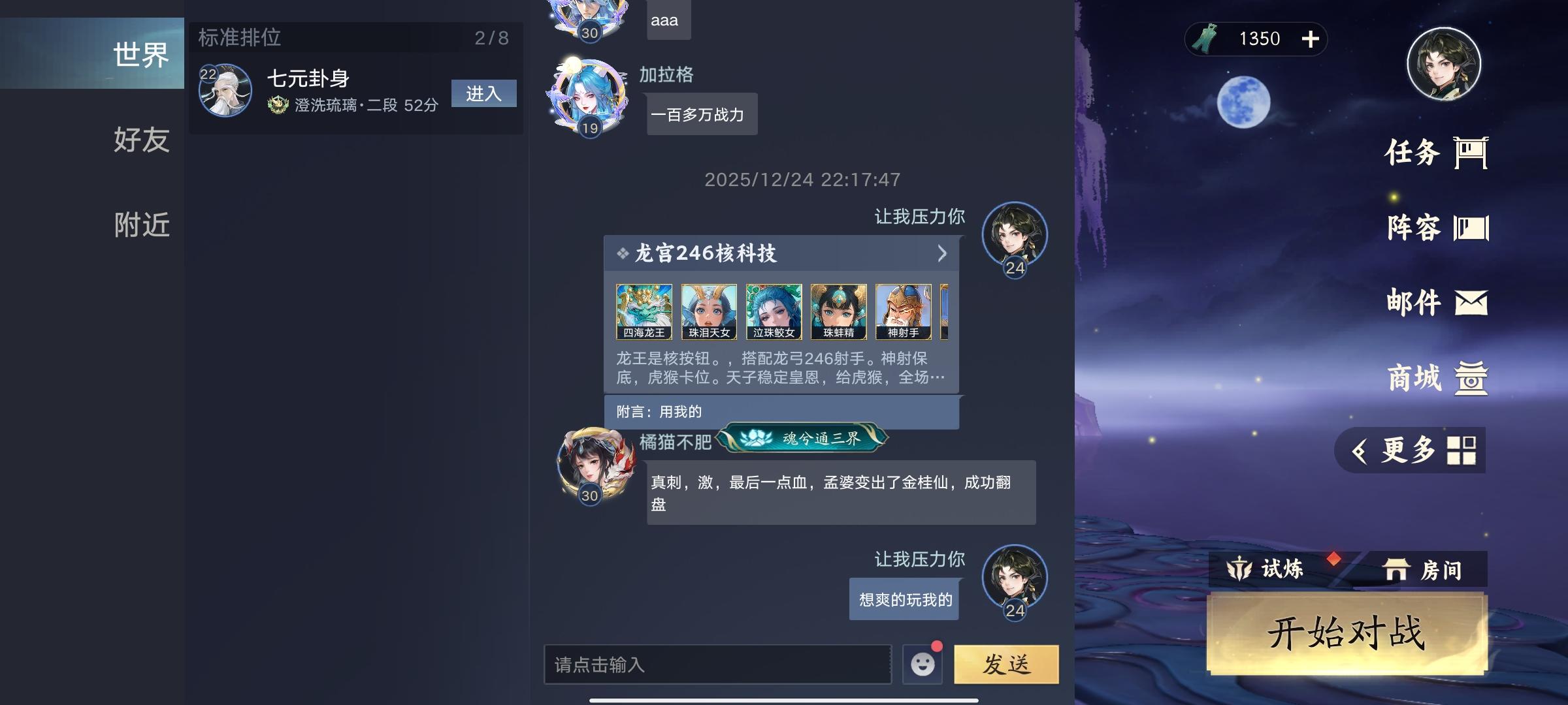 关键词:龙宫,回合结束,远程兵种 推荐本局阵营:龙宫 基础理论: 通过【珠蚌精】【泣珠鲛女】【珠泪天女】的连锁激活提供高额成长,【龙王】全场激活提供多倍成长 核心卡: 变阵 组件卡: 资源卡牌: 你都玩龙宫了要什么资源卡! 如果非要的话 注意要点: 1.在战力成长方面,三姐妹越多越好(仅限于目前版本,当前版本数值不平衡和突击阵容弱势,可以无脑全射手,后续版本平衡后必须搭配朱雀玄武) 2.在凑齐