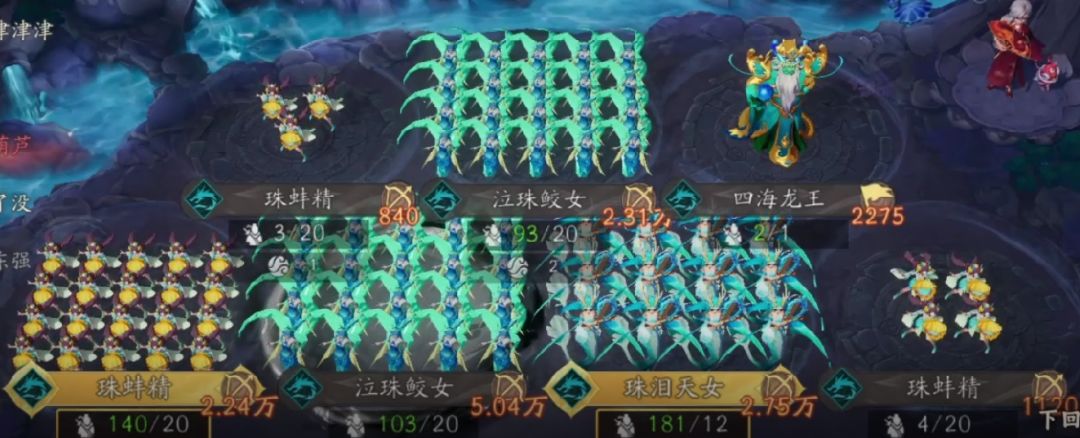 注意这局要有龙宫! 第1回合没有刷到蟹甲士(3灵石价值,不亏钱,可以稳血),就直接开技能,魍魉、恶犬(不亏钱、稳血)优先 第2回合直接升本,除非有蟹甲士,下回合升本 第3回合,直接开技能,同样经济性兵种优先,山猪、魍魉、恶犬、鲛人前锋,商店有泽精就买,但是不要刷新浪费资源 后面灵石不够1口气升到4本,就不要升到3本,重复第三回合操作,开技能选兵。 能升到4本后能升本开技能就升本开技能,不能升本就直