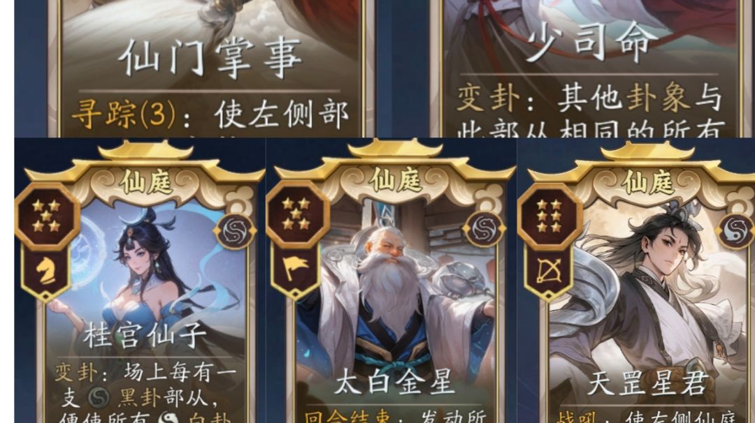 关键词:仙庭,变卦,寻踪,战吼 基础理论: 通过【仙门掌事】【少司仪】的组合全场变卦,【桂宫】变卦全场高额收益,【天罡】提供两仪,【太白】稳定寻踪 核心卡: 【仙门掌事】【少司仪】【桂宫】【天罡】【太白】 组件卡: 资源卡牌: 仙庭蛤蟆:无图,变卦:获得仙庭宝箱。配合少司命掌事和紫府,可以提供大量资源和体系牌,一次性使用,不用站场 备选卡牌: 仙庭不需要外援,如果非要的话,可以带青龙四圣,但意义不