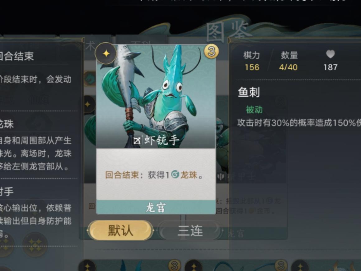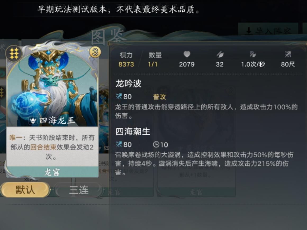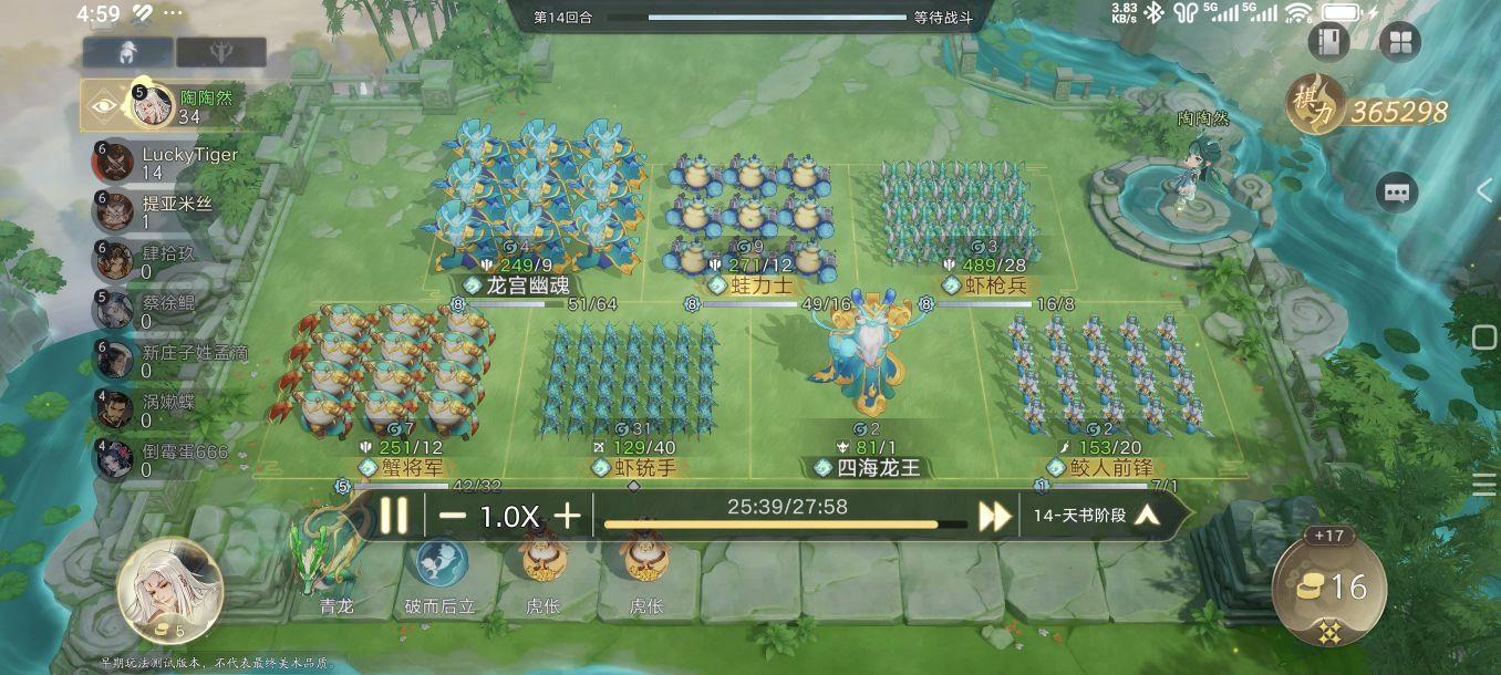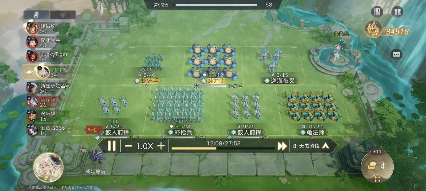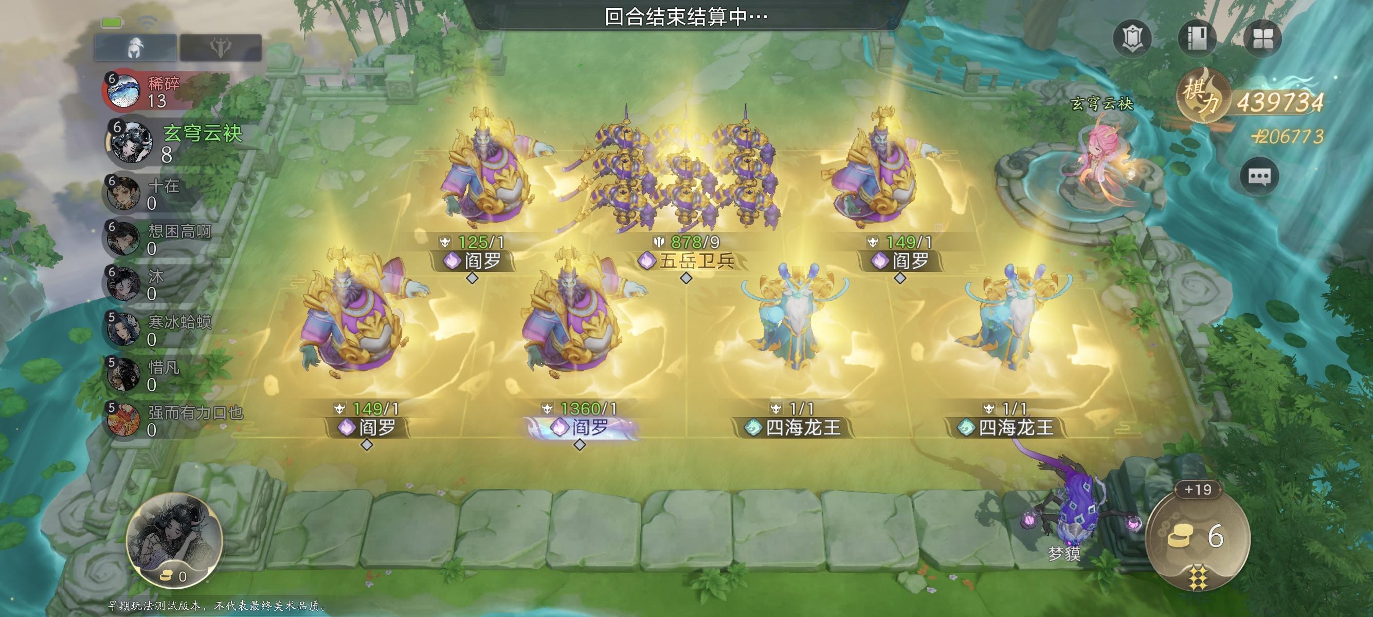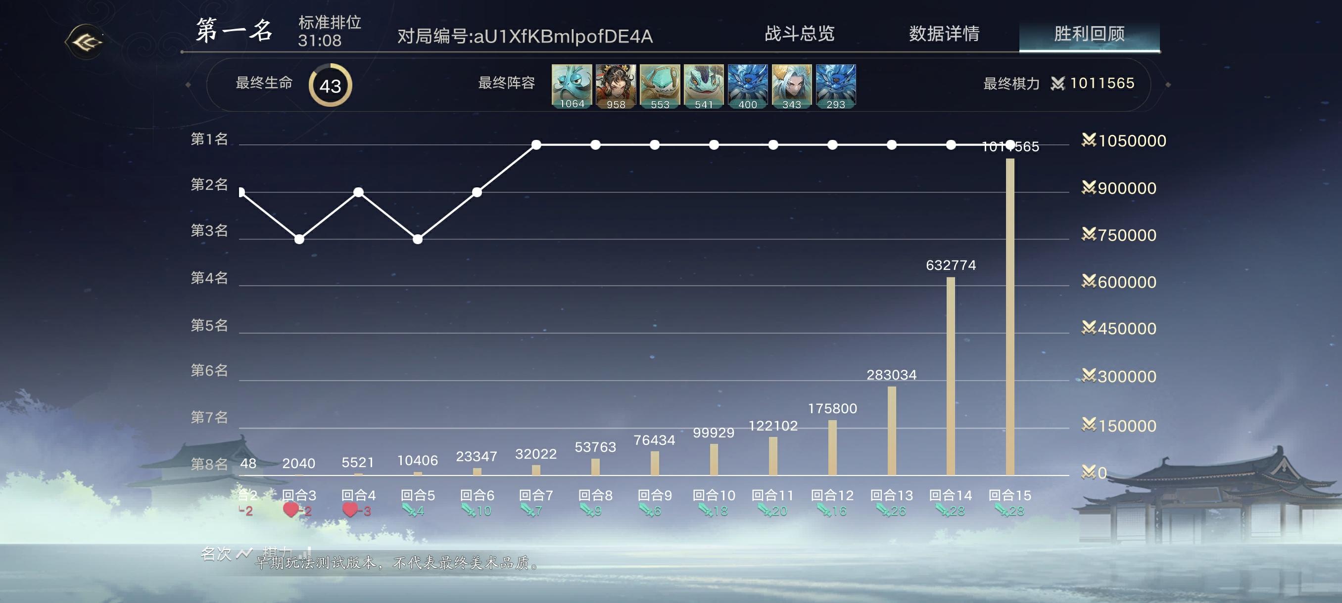 该流派充分利用龙宫珠光优势,凸出一个稳字,循序渐进,搭配一些特定的幻神也有较高的吃鸡率.基本战力10回合8万到12万,15回合到60万到100万左右,虽然上限不如一些套路,但下限非常高.战力增长曲线大概如下图,节奏非常稳健,除了前5回合战力偏低容易被入外,整体非常稳健.整体节奏分为前期后期两个阶段.前期前期已虾统手,虾枪兵,鲛人前锋,龟丞相,蛙力士,巡海夜叉,也就是前三星的龙宫牌基本都需求,主