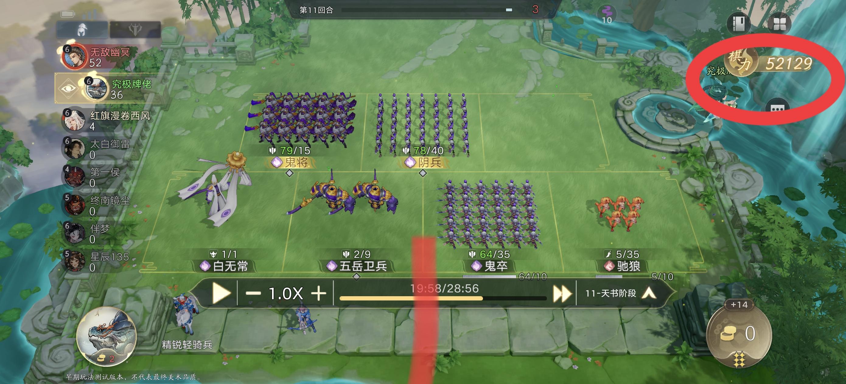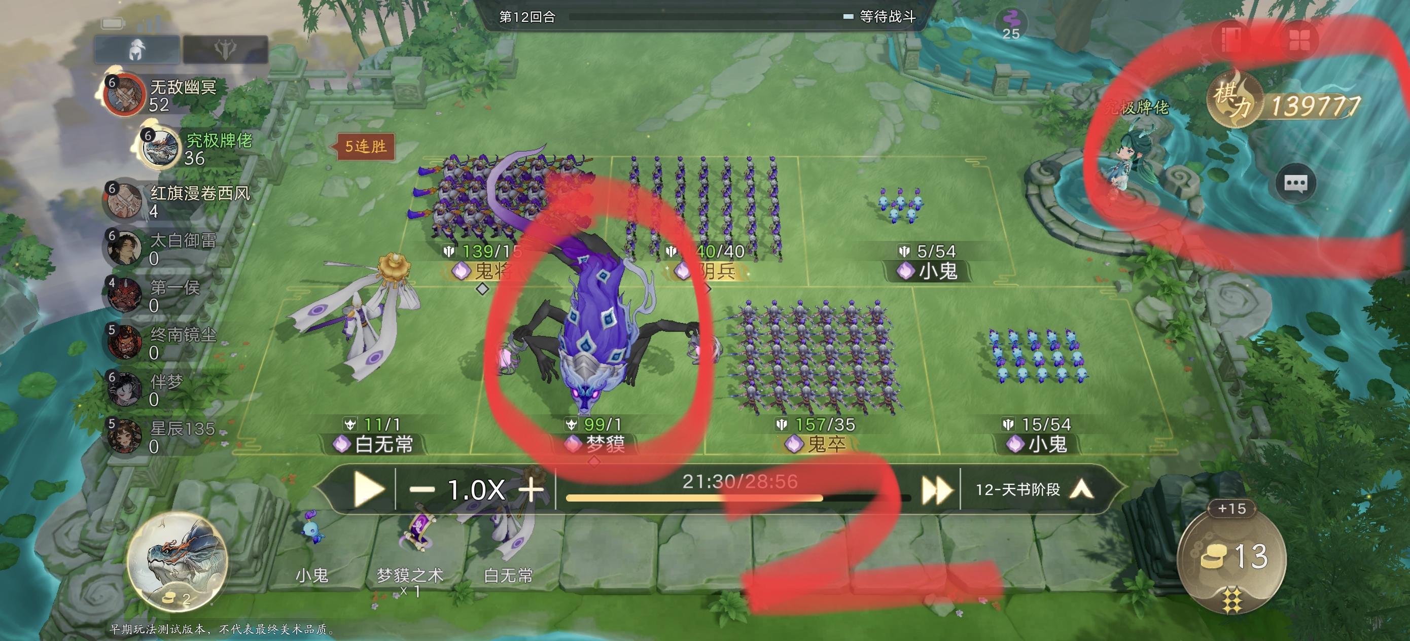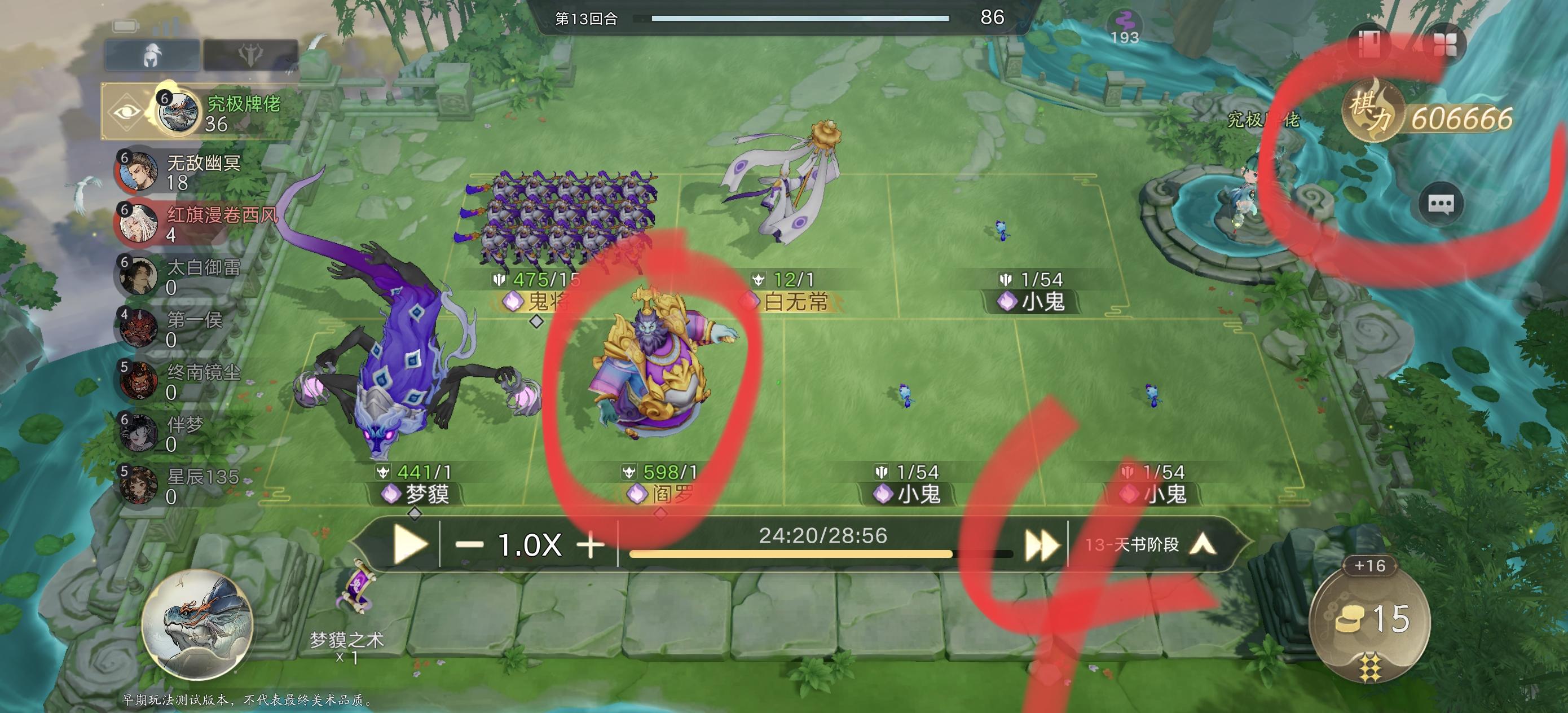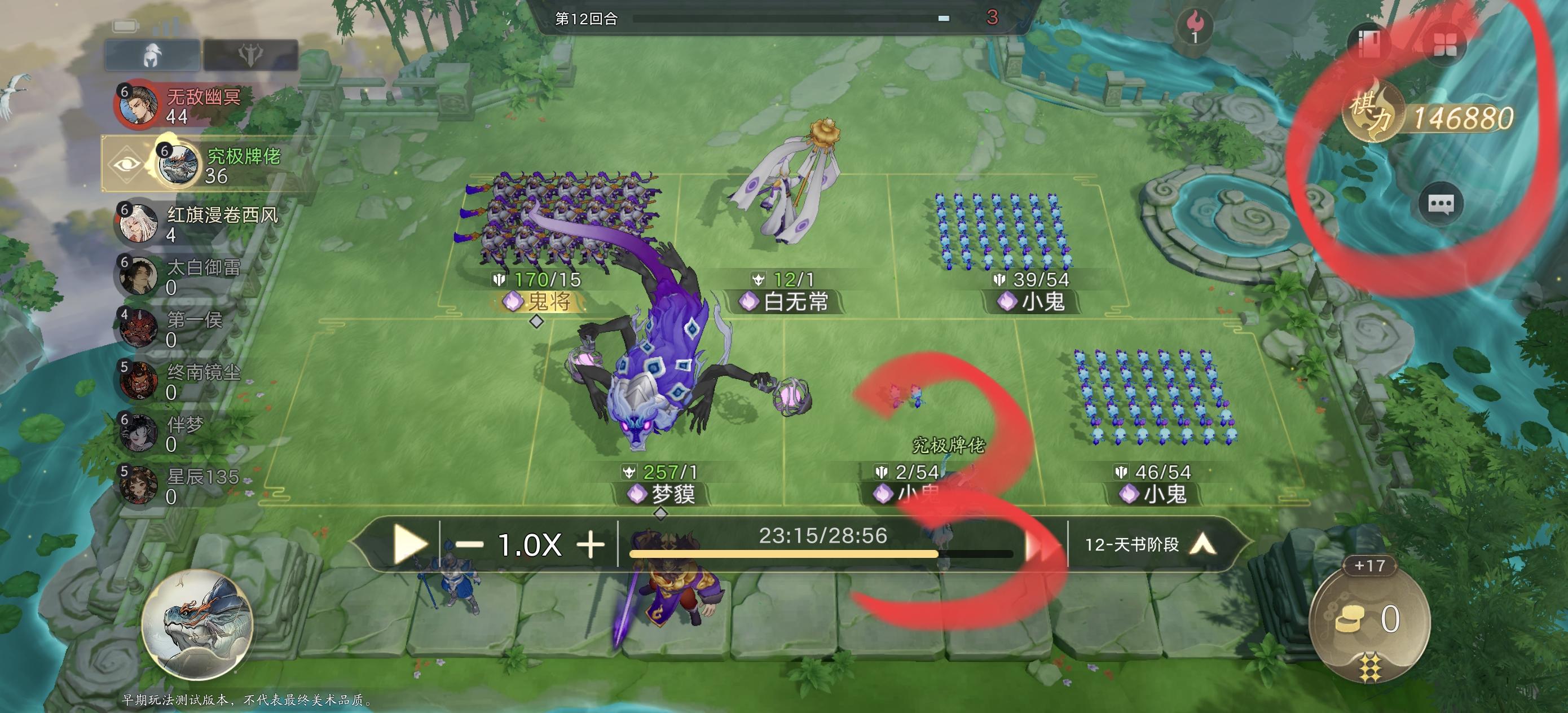 这游戏究竟有没有电脑,我用4张图来说明,分别是每回合开始和每回合结束的截图 图2是12回合刚开始,和11回合结束,电脑突然多了几个小鬼和一个梦魇。11回合结束时候是5万战力,12回合一开始就直接14万了。 图3是12回合结束,图4是13回合开始,直接变成60万,多了个600数量的金阎罗。 图5是即将进入战场的战力170万,图6是进入战场的战力280万。这是内测,你就用电脑这么整我们玩家是吗