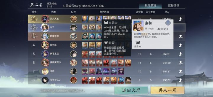 那个老4老是复活,死了还能玩 ,我都无语了一直跟我打,打了数不清的回合了,差点都变彩色了,还有那个名字叫玩家3的也不死,后来那个叫天生最爱的退游戏了就完事了,他最后弄个70万的战力值但是我后来一直没对上他,他最后退游戏了给我卡掉了才退