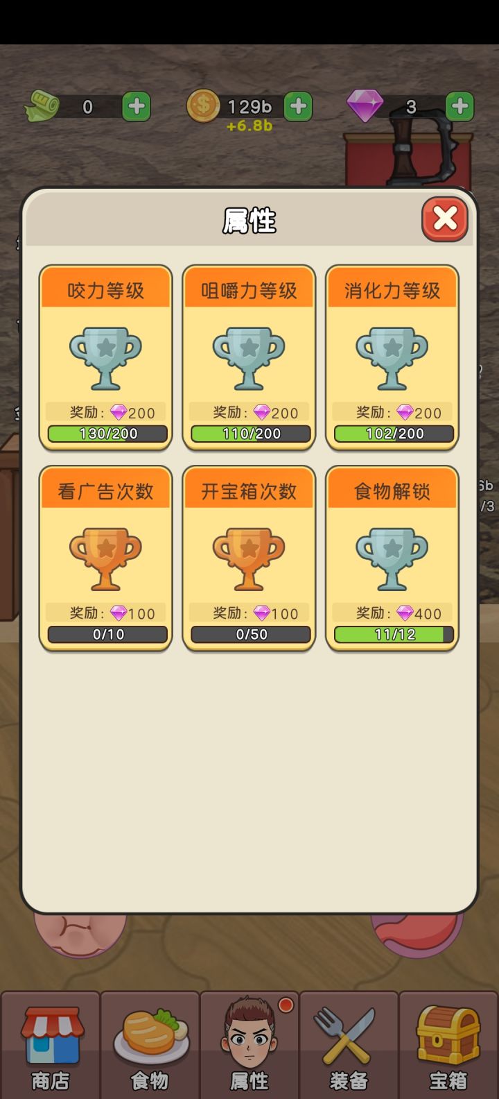 这游戏人物吃东西就能获得金币。这人物一开始吃个土豆费老劲了。然后现在稍微提升了一下,能吃三个土豆。但说实话,还是那老原始人,这得吃到啥时候能吃到现代去后面的我再解锁解锁。在做评价。画面和音乐挺有意思的。