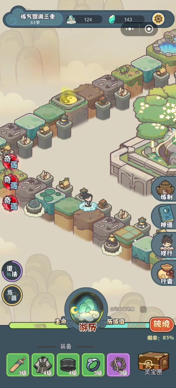 1,地图选择 除了第一章新手地图上限为元婴初期一层,2图是化神初期一层,应该是每一章图提升一个大境界上限,一旦到达上限游戏立即结束,天命点收益只和境界相关。 2,经验现在是游戏的命脉,除了跑图以外,获得经验主要来自事件,商店,炼丹,和做装备,而装备占其中大头,所以要大量建造矿场获取矿石。 3,地图系统,每次进图随机生成1到7个的事件灵脉(触发强制战斗或者随机事件),位置随机,想多一点建筑灵脉可以反