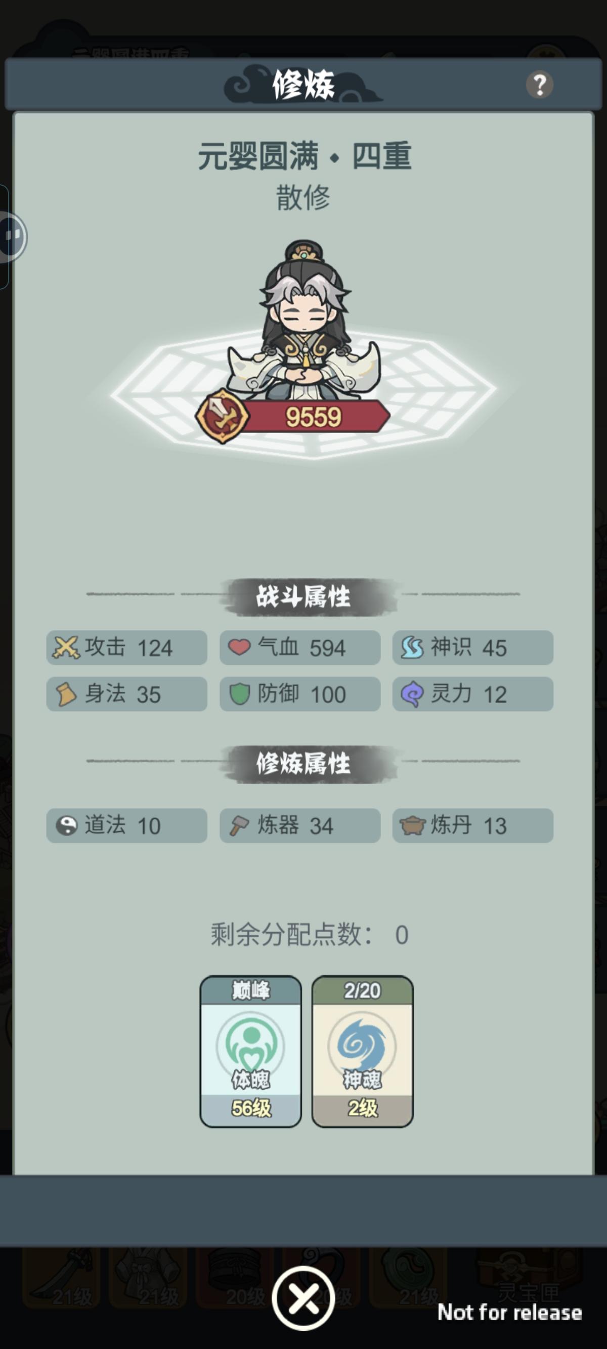 说实话,这次更新感觉不好玩了1.灵脉最高15级2.境界到元婴就结束了,经验获取变的很少,必须多拿道法提升道法等级,没装备的道法升级也会增加道法等级,不能只点一个道法,固定了一个世界后道法也没改变,导致很多道法基本无用,比如世界灵气的道法就完全没用了(元婴一层突然结束,忘记截图了)3.前期很缺灵石,但是后期基本不缺,最好是把仙庐建在一起,然后2级点加50%的建筑,3级点玄塔,走上去加一大笔灵石