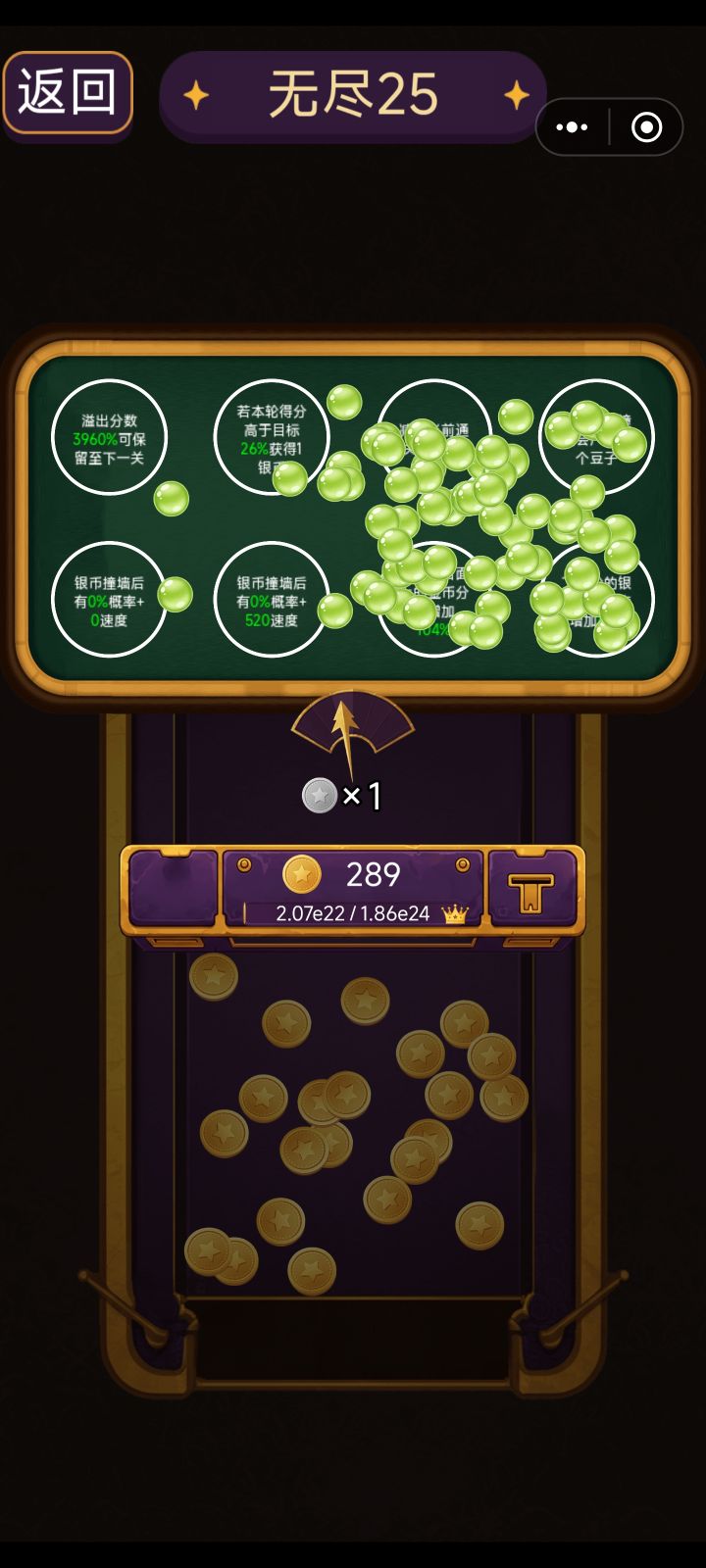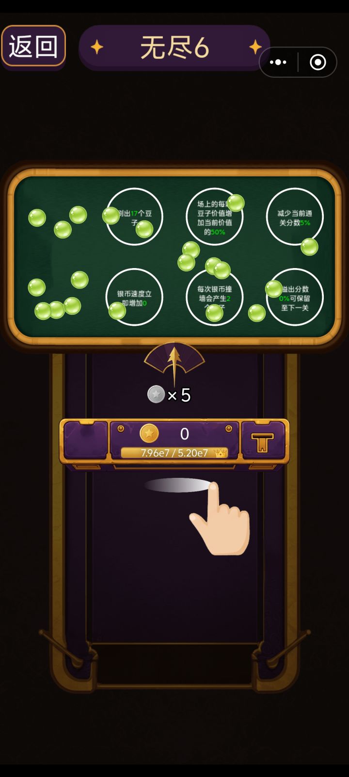 #游戏讨论 这一组玩到毕业,唯一的缺点就是跟叠羊刀一样,一直叠豆子的数量,目标要在最后一颗硬币的时候才能达成。选卡不能选有上限的,优先对整局有效,比如速度,你得一直让它处于触发的状态,猴子或者河马都行,老虎那些五次上限就动不了,没啥用,速度很重要跟永动机一样,比如增加豆子数量,豆子数量等于掉落的金币数量,金币数量就是目标,玩了几个小时,通关了,完事就无尽模式。