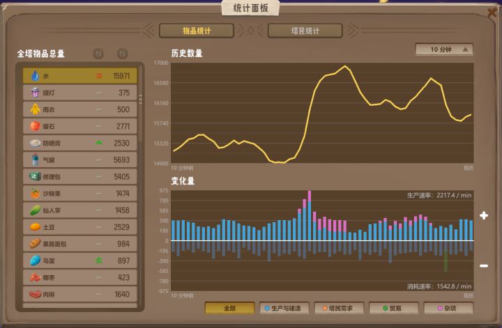 新特性:- 新增了【统计面板】,可以查看所有物品的总数量、历史变化趋势、增减速率,还可以查看塔民的人口变化趋势。- 新增了【只看该物品】功能。在分层统计UI中按住Ctrl键点击物品图标,将只显示这种物品的统计,可以更方便地查看它在全塔的分布情况。- 新增了【清空本层物资】功能。在分层统计UI中点击垃圾桶按钮,就能将这层的所有物品清理掉。- 建造时,在塔身和建筑表面的可建造区域增加了绿色网格