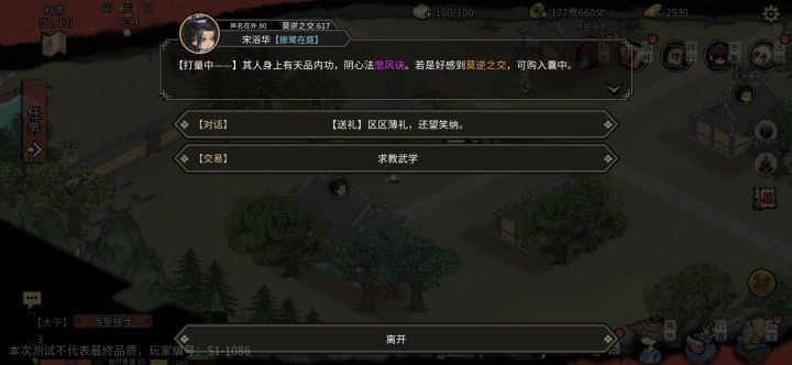 我是第二次测试了2025.11.15——2025.11.28结束,这一次的测试内容主要添加了自创武学,主线任务,帮会,生活技能等玩法,不是很多,有很多没有实装首先,这个游戏,它不是烟雨那种回合制的游戏,而是实时放技能的那种游戏,也可以说是肉鸽游戏,喜欢玩回合制的玩家们,萌新们,要注意啦!避免入坑。自创武学,这个武学分为,黄品,玄品,地品,天品,绝品,传世等,需要大量的造诣和修为来自创武学。目