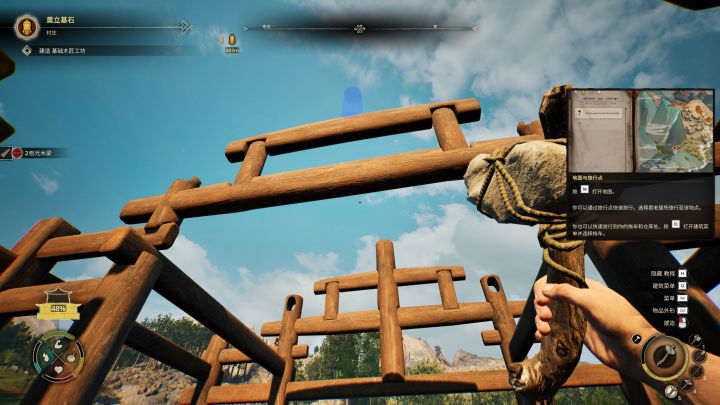 和许多建造模拟器一样,游戏最开始都要从准备材料等基础做起。一些简单的材料比如木材、竹子、粘土、沙子都是初级加工材料,简单采集就能实用。但是木材、石头、粘土等东西还有进一步加工的用途,像木材可以做原木当支撑、可以做网格当墙壁框架、做房梁稳定房顶;材料的加工品还可以进一步加工,比如木框可以加工成网格,这些东西都是在各种建筑中必不可少的一环,因此基础材料的需求特别大。早期的建筑材料需求少,而且都是基础材料,我们可以一个人来完成,等到后面解锁的建筑越来越复杂,就不是只靠个人力量就可以快速完成的了。