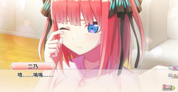 相比TV番剧,游戏的画面表现就精致了不少,虽然整体上还是走的动画风路线,但您看这笔触运用,根本就是脱胎换骨好吧。配合上眼神和肢体的变化,妹子们的可爱程度还能加十分。当然角色还原度这种事情就更不用操心了,发型、发色、发饰等细节差异都安排到位了,服饰上也符合个人的性格特点,哪怕新同学也能比较轻松的对五姐妹进行区分。另外随着剧情推进,也会有些让人怦然心动的高质量CG呈现在大家面前,嗯大家在GALGAME见过很多了,而这也能成为游玩的极大动力。