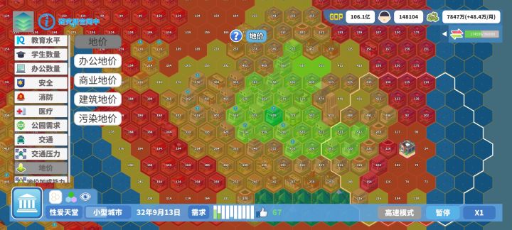 1.居民区六边形6+1建筑阵法(警、消、交、医、园、小、中+大学插空)打底,具体可以改,不死板,多出来的警和消占有的格子可以涂上低消商业街,加地价。布局的时候阵和阵之间不用卡那么死,留点空隙放辅助建筑。2.特殊建筑不需要警、消、交通的:三个工厂、大学、公园,灵活使用有奇效,但相同建筑地价效果不叠加。3.大格局上用居民区夹着商业办公区,接壤的地方,向外地价递减依次建造高、中、低居民区,合理利用地