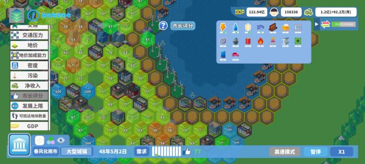 1.居民区六边形6+1建筑阵法(警、消、交、医、园、小、中+大学插空)打底,具体可以改,不死板,多出来的警和消占有的格子可以涂上低消商业街,加地价。布局的时候阵和阵之间不用卡那么死,留点空隙放辅助建筑。2.特殊建筑不需要警、消、交通的:三个工厂、大学、公园,灵活使用有奇效,但相同建筑地价效果不叠加。3.大格局上用居民区夹着商业办公区,接壤的地方,向外地价递减依次建造高、中、低居民区,合理利用地