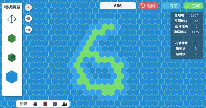 自建地图功能经过修复后已重新上线,请大家更新到最新版本体验。在建造地图模式下,默认选择的是移动功能,该模式下可以自由移动地图。左边依次是平原、山地、海洋三种地形。地形旁边的按钮为填充模式。依次是单点绘制、一圈绘制和同类型填充。下方则是各种资源的选择。绘制完成后,点击右上角完成即可。