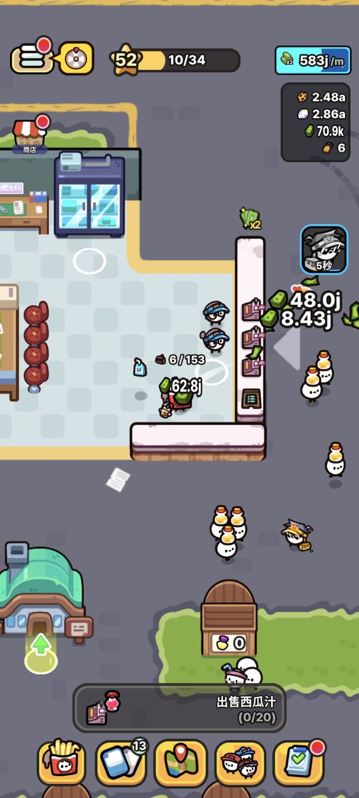 最后一关每天有三次小偷任务,大概每50分钟一次,首先说一下小偷的机制,打死小偷你会获得三倍赃款。所以只要利用这一点就很轻松靠这三波小偷把收益拉满,甚至远远大于挂机一天的收益。以下是操作方法:1.升级优先升最贵的沙冰机,每30级是质变2.挂机收最贵的沙冰,冰箱和背包都塞满3.8:20小偷任务开始,有的货币全用上(市场里有超级暴富币),沙冰全部上架,注意其他摊位尽量空着,绝一点可以让员工不搬货保