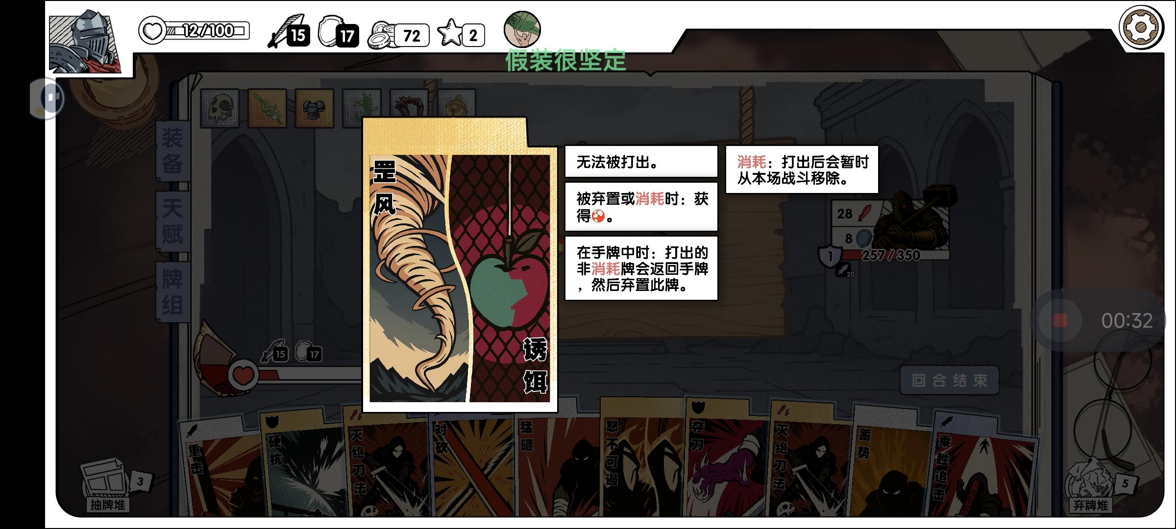 核心牌:后撤步凝神上面那俩属于这把没有基本就开不了的程度,二者之中只需一种一张即可,不过如果先出凝神后出后撤步,则依旧要选后撤步。与下面的其他牌共同出现时,优先选这两张,流水的输出铁打的辅。主力牌:罡风诱饵后手蓄势诱饵和后手看到就拿,罡风在进BOSS前的那两轮若还是没拿到后撤步或凝神,则需拿,其余情况不拿。主力装备:狂战头盔溢怒抽二,强力过牌,出了必选。输出牌:乘胜追击