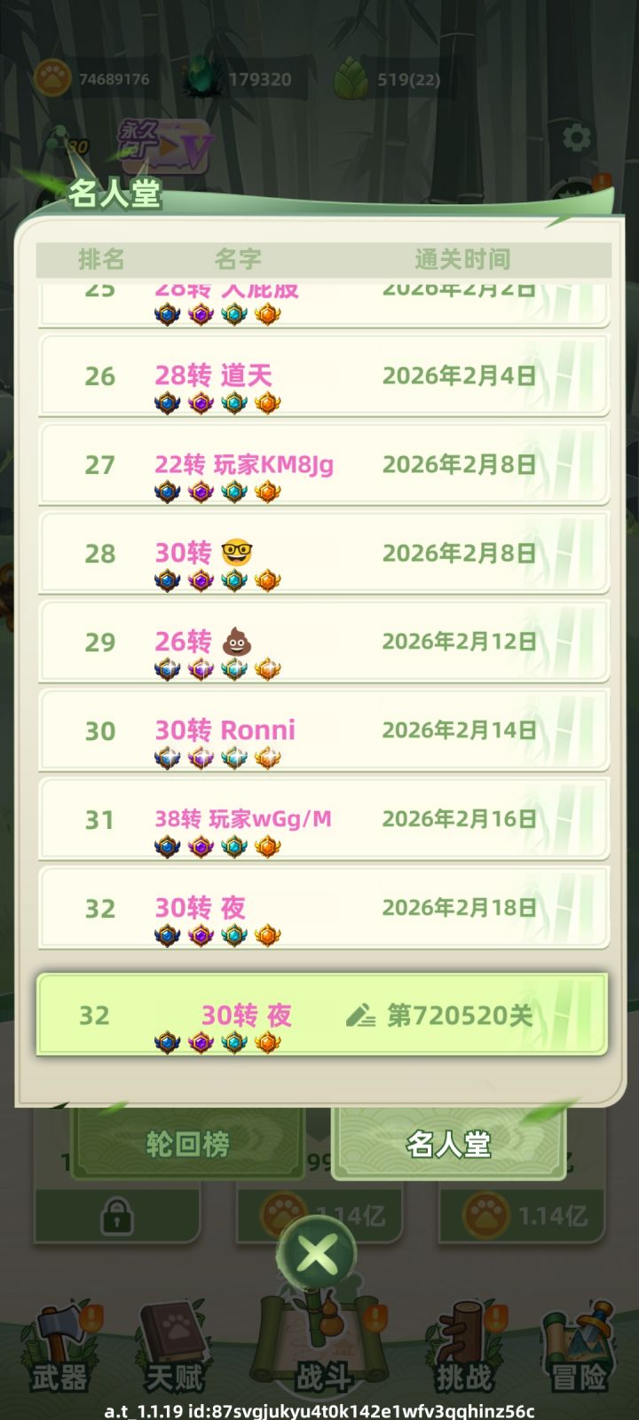 终于过了,今天想起还有攻略一说,抄了一下大佬的攻略过了后三个道祖(可以直接去精华里面看)#转生名人堂攻略https://www.taptap.cn/moment/762293772171087056?share_id=3a17380de498&utm_medium=share&utm_source=copylink防具和宝物是过最后一关用的,免广是去年抽奖中的,之后应该就是每日收收菜,看能不