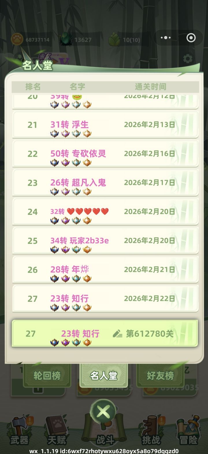 终于过了,今天想起还有攻略一说,抄了一下大佬的攻略过了后三个道祖(可以直接去精华里面看)#转生名人堂攻略https://www.taptap.cn/moment/762293772171087056?share_id=3a17380de498&utm_medium=share&utm_source=copylink防具和宝物是过最后一关用的,免广是去年抽奖中的,之后应该就是每日收收菜,看能不