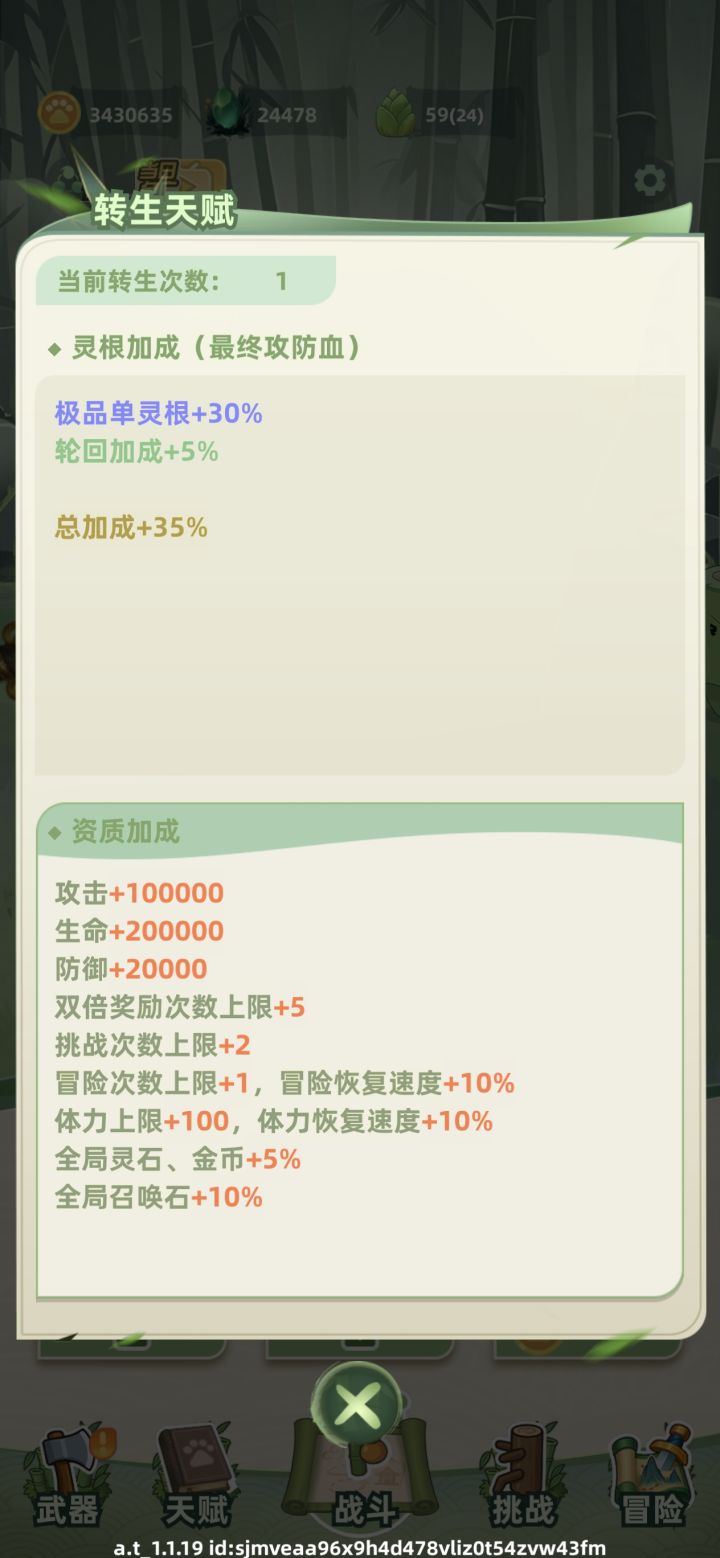 终于过了,今天想起还有攻略一说,抄了一下大佬的攻略过了后三个道祖(可以直接去精华里面看)#转生名人堂攻略https://www.taptap.cn/moment/762293772171087056?share_id=3a17380de498&utm_medium=share&utm_source=copylink防具和宝物是过最后一关用的,免广是去年抽奖中的,之后应该就是每日收收菜,看能不