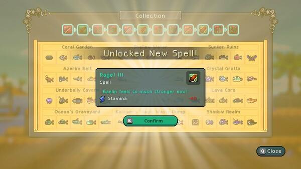 真正的钓鱼在本质上是某种QTE形式的战斗。鱼在上钩后其实我们连拉杆都不需要,而是在屏幕显示“快攻击”的时候就快速按攻击键削减鱼的生命值;当屏幕显示“停止攻击”时则专注于格挡以及完美格挡,如果在此时还强行攻击,鱼线会发生断裂导致直接失败。当然在这个博弈的过程中,玩家还可以消耗耐力释放一些咒语,咒语的解锁强化则依靠图鉴解锁而达成,某些装备也有强化效果。还可以使用一些药剂恢复耐力或短暂强化攻击等等,但感觉经常会忘记使用。