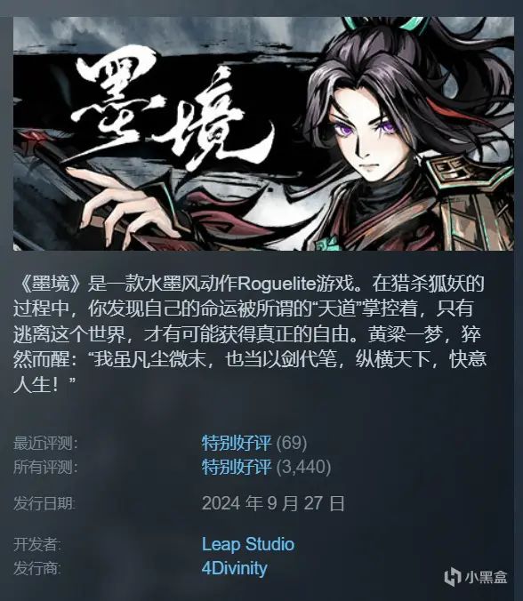 从2024年9月27日抢先体验发行开始历经一年半多,在steam平台上共收获3440篇用户评测,其中有91%为好评,整体评价为【特别好评】的国产水墨风动作肉鸽游戏《墨境》正式版,即将于2026年5月26日上线!《墨境》是一款水墨风动作Roguelite游戏。在猎杀狐妖的过程中,你意外发现自己的命运被所谓的"天道"掌控着,只有逃离这个世界,才有可能获得真正的自由。黄粱一梦,猝然而醒:“我虽凡尘微