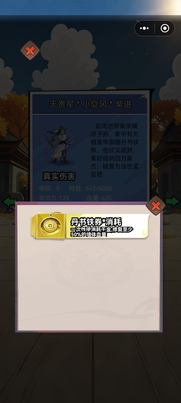 本次发布版本V1.0.5版本,更新内容:1、新增英雄“小旋风”柴进,掌管财库引入消耗金币提升攻击机制。技能特点:穿心透骨剑:向敌方发射飞剑造成80%真实伤害仗义疏财:持续投掷金币造成真实伤害丹书铁券:一次性使用大量金币修补城墙2、新增金币奖励,每日签到和关卡中都可以领取金币注意:新增角色柴进技能会通过大量消耗金币巨大提升攻击力以及对城墙进行修复3、新增道具机制,在关卡中可以使用道具,增