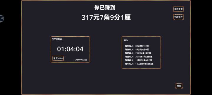 功能很简单的小游戏,玩法其实并不复杂,但很多世界观的东西联系在一起,给人一种不一样的游戏体验,更多可能还是对现实的绝望。普通人一辈子难以挣到的年薪、月薪,甚至时薪,在这里都可以轻松设定,买豪车住别墅,在加速的情况下分分钟完成,真正意义上的数十年人生弹指一挥间。
