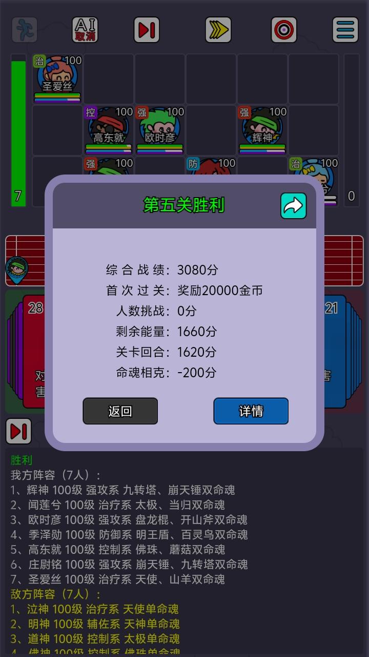 综 合 战 绩:3080分首 次 过 关:奖励20000金币 人数挑战:0分 剩余能量:1660分 关卡回合:1620分 命魂相克:-200分闯关阵容(7人 140回合):1、辉神 100级 强攻系 九转塔、崩天锤双命魂2、闻莲兮 100级 治疗系 太极、当归双命魂3、欧时彦 100级 强攻系 盘龙棍、开山斧双命魂4、季泽勋 100级 防御系 明王盾、百灵鸟双命魂5、高东就#斗神大陆2