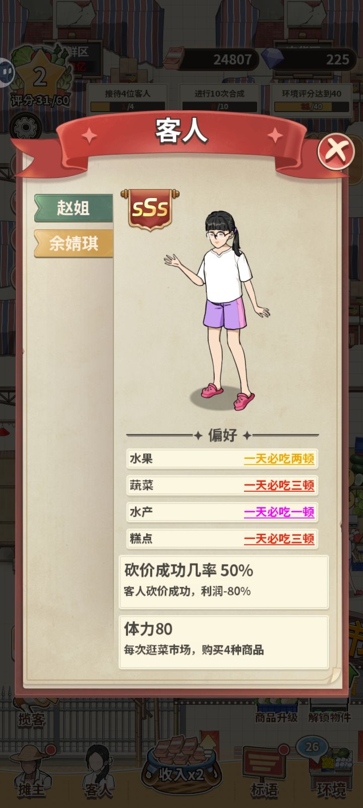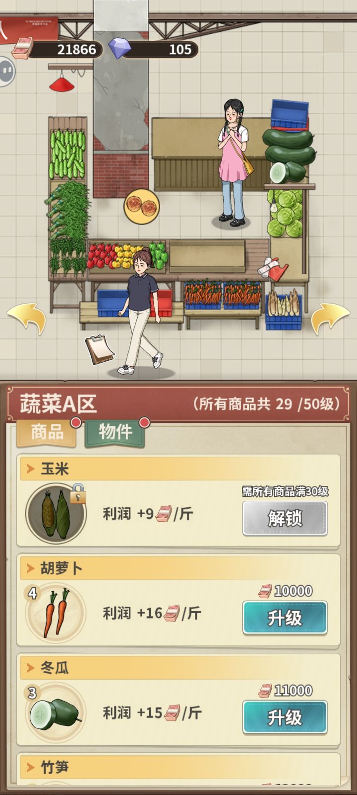 轻度放置模拟经营类游戏,和王蓝梅系列很像,这次的主题是菜市场。由摊位开始逐渐丰富,蔬菜辅食等都是日常生活常见的东西,非常接地气。