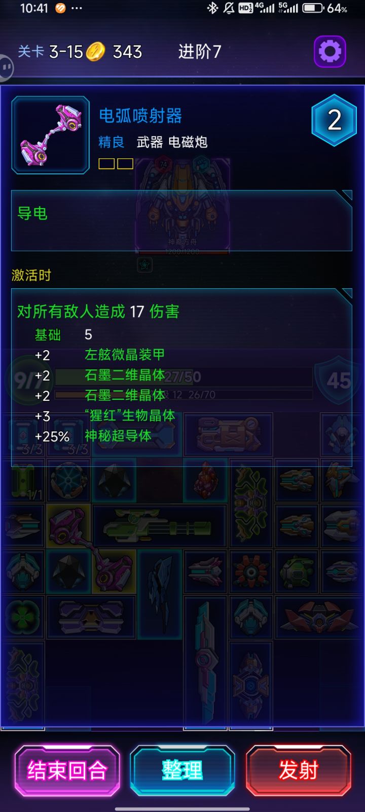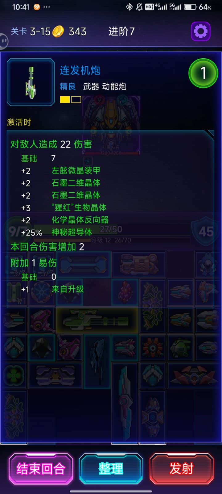 有一个bug。应该是武器升级效果“每回合第一次激活能量消耗-1”与暗能量撕裂者激活后效果“使相邻武器本回合能量消耗-1”冲突,导致后者不生效。是升级了反物质巨炮减能量后发现的,本来升级前一回合能以一能量消耗触发四次(本局情况,指包含护盾减能量升级),升级后变为消耗1能量、2能量、接着剩余1能量无法触发。如果效果正常触发,应为巨炮首次消耗0能量、后续消耗1能量四次,共计五次(本局情况)。