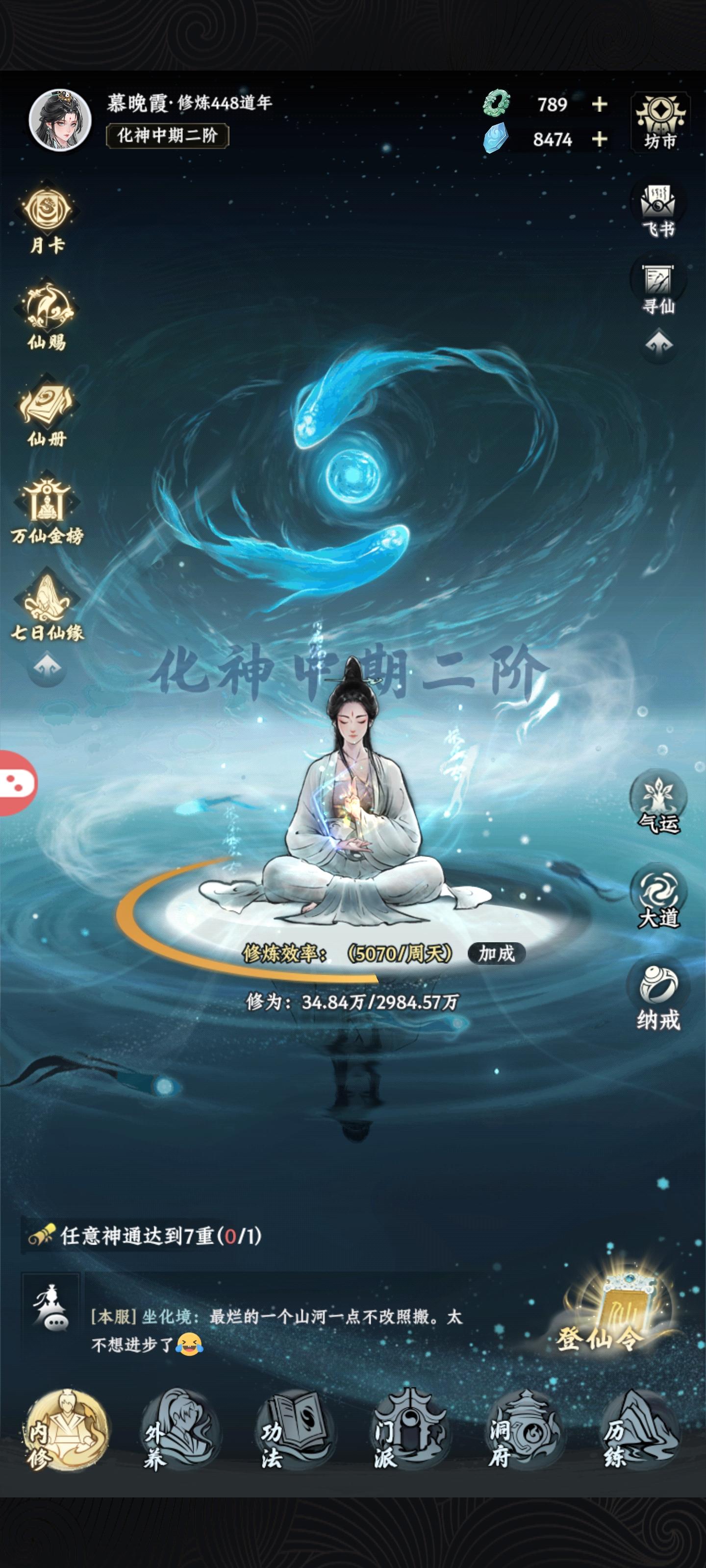 事先声明我没玩过无极,我只玩过凡人传说和一念逍遥,我会按这两种游戏的思路去分析这张图片,看看能不能挖出来一些好玩的,先放张原图,顺便吐槽下这图怎么这么糊啊先看左上角,头像名字没什么好说的,这个道年不知道是不是参考了一念,我还是比较好奇制作组会怎么设计一年是多少分钟呢,据我了解无极一天是强制一百年的,凡人和一念一天是96年,修为境界可能也是参考了一念,中间这两个我猜前面的是氪金买的,材质花纹有
