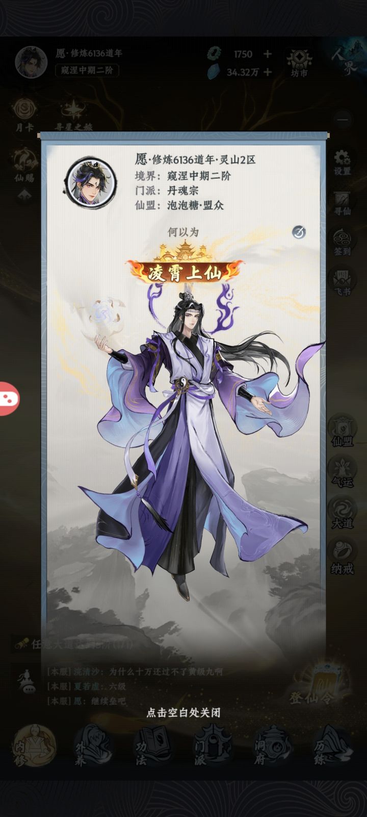事先声明我没玩过无极,我只玩过凡人传说和一念逍遥,我会按这两种游戏的思路去分析这张图片,看看能不能挖出来一些好玩的,先放张原图,顺便吐槽下这图怎么这么糊啊先看左上角,头像名字没什么好说的,这个道年不知道是不是参考了一念,我还是比较好奇制作组会怎么设计一年是多少分钟呢,据我了解无极一天是强制一百年的,凡人和一念一天是96年,修为境界可能也是参考了一念,中间这两个我猜前面的是氪金买的,材质花纹有