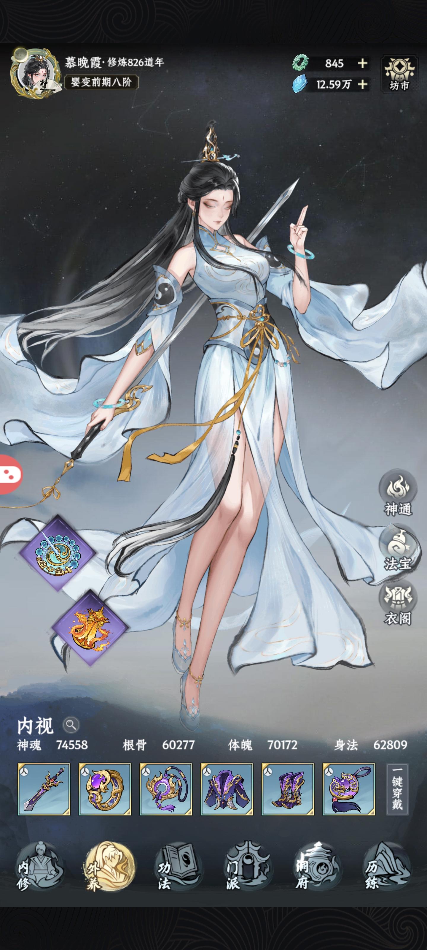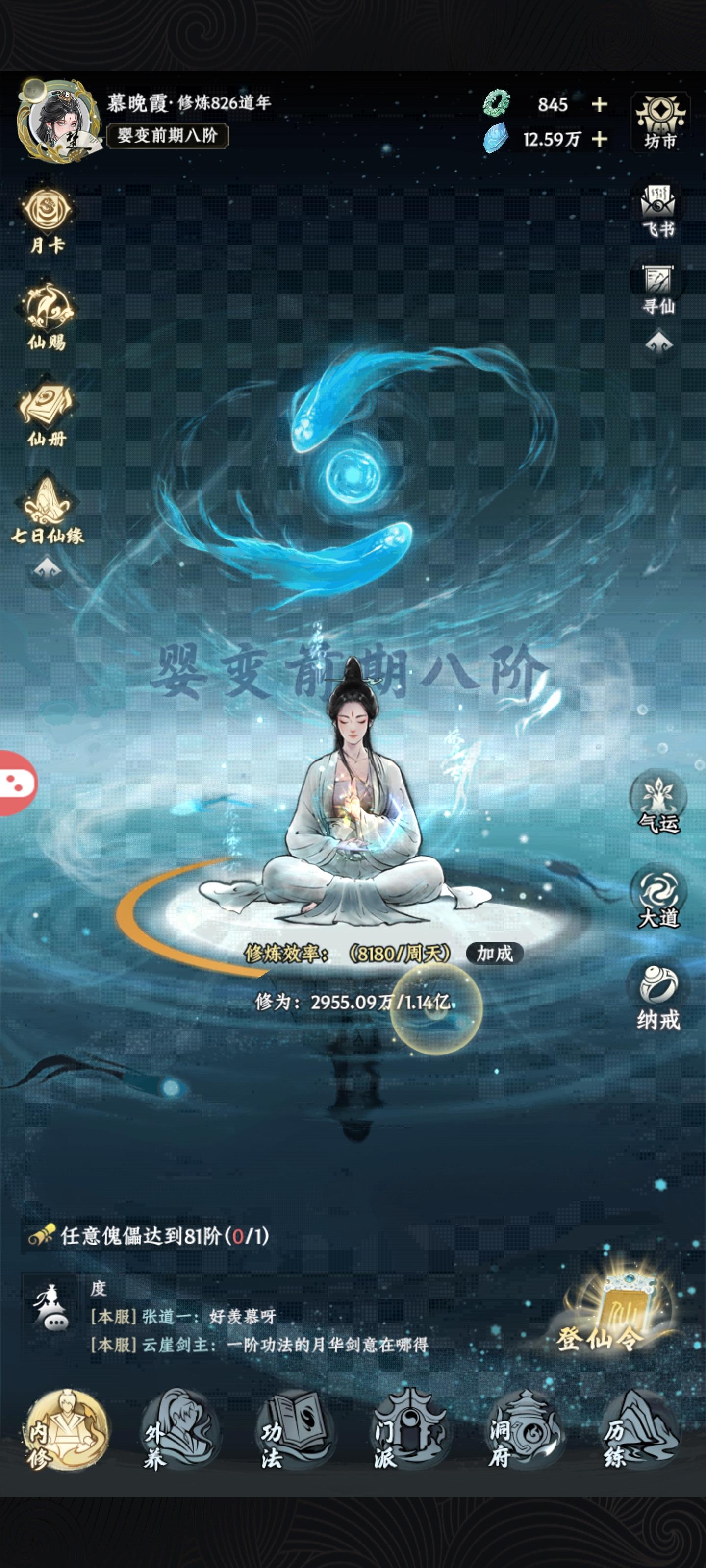 事先声明我没玩过无极,我只玩过凡人传说和一念逍遥,我会按这两种游戏的思路去分析这张图片,看看能不能挖出来一些好玩的,先放张原图,顺便吐槽下这图怎么这么糊啊先看左上角,头像名字没什么好说的,这个道年不知道是不是参考了一念,我还是比较好奇制作组会怎么设计一年是多少分钟呢,据我了解无极一天是强制一百年的,凡人和一念一天是96年,修为境界可能也是参考了一念,中间这两个我猜前面的是氪金买的,材质花纹有