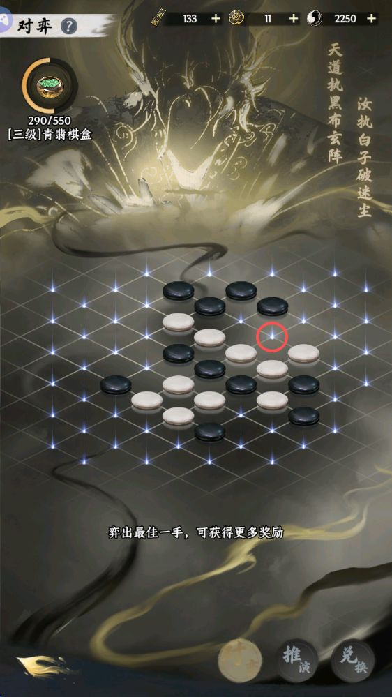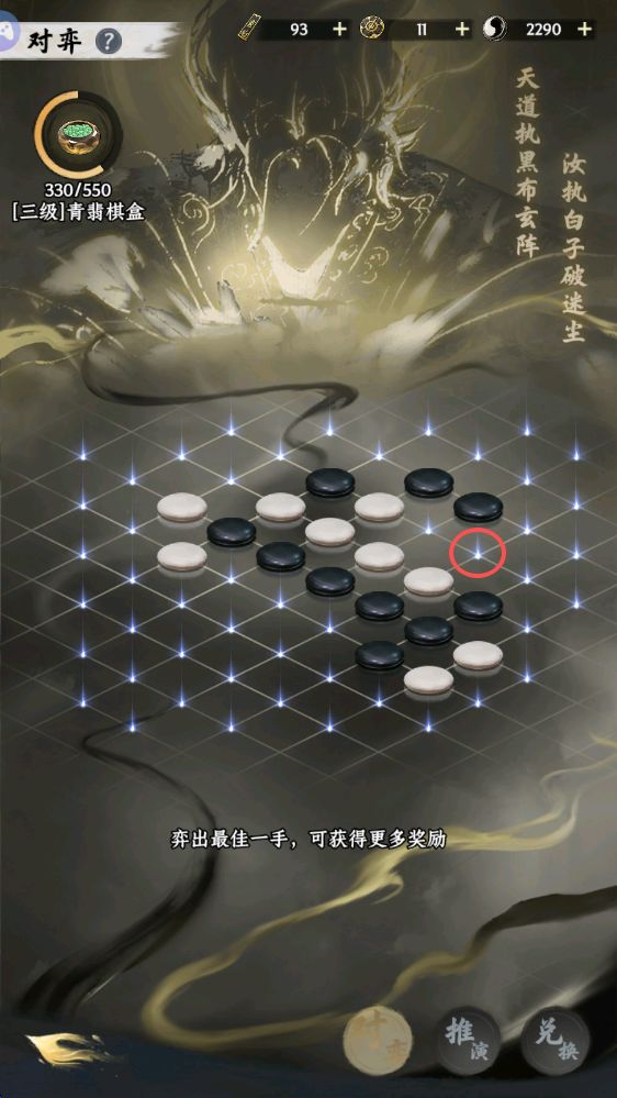 #大道仙途攻略 通常大家随便点击的时候一般都是获得十次奖励的玲珑妙手,按图中所示落子可触发神之一手获得12次奖励。